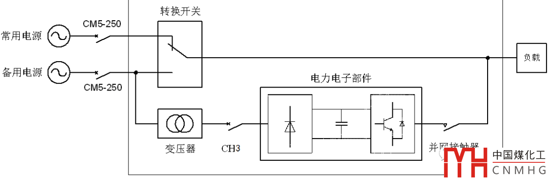 答:請參閱圖1,轉換裝置分為機械部分(圖中上部)和電力電子部分(圖中下部),機械部分供電意思為機械部分接通電路,為負荷供電。