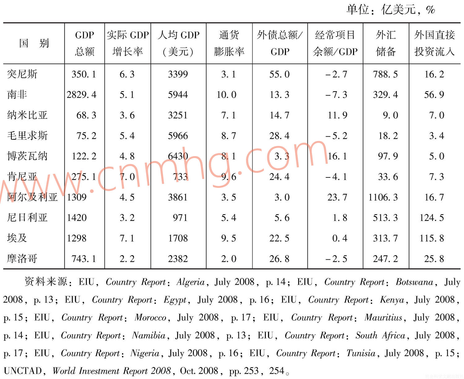 南非是非洲經濟最發(fā)達、工業(yè)化水平最高的國家,國內有4760萬人口,市場容量大。南非的法律體系透明度和穩(wěn)定性好、效率高,基礎設施完善,腐敗和恐怖主義對企業(yè)造成的成本低,金融市場比較成熟。埃及、阿爾及利亞也是非洲經濟發(fā)展狀況良好、工業(yè)化水平較高的國家,全國總人口分別為7600萬和3390萬,市場容量大。尼日利亞是非洲人口最多的國家,有1.46億人,國內市場容量很大,但其國內對石油工業(yè)依賴性較強,工業(yè)多樣性較差。近兩年,因為尼日爾三角洲的社會騷亂導致尼日利亞的經濟增長率出現下降,從2005年的7.2%下降到2006年的5.6%和2007年的3.2%。[2]2008年以后,尼日利亞社會動蕩趨于平穩(wěn),石油產量隨之增加,經濟增長也將趨于穩(wěn)定,預計2008~2010年實際GDP增長率將達到6.6%。[3]
