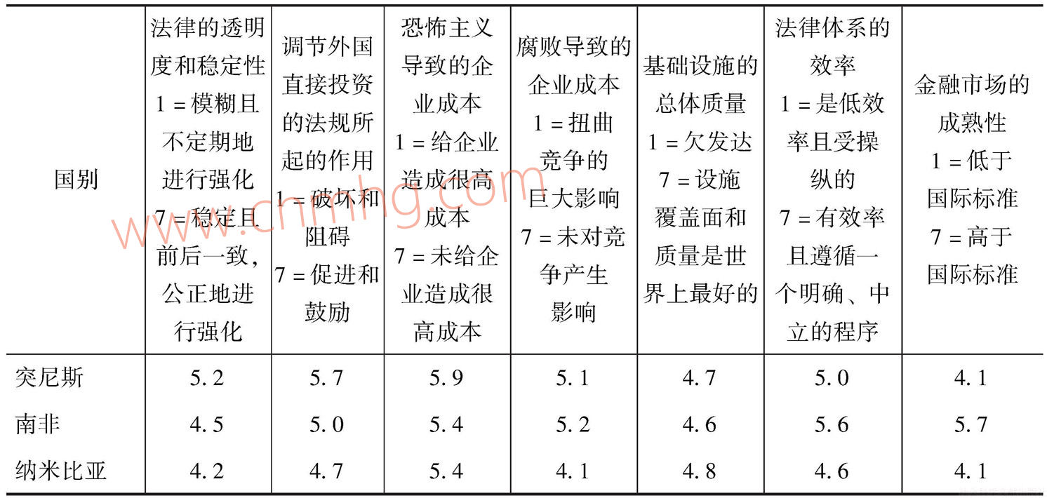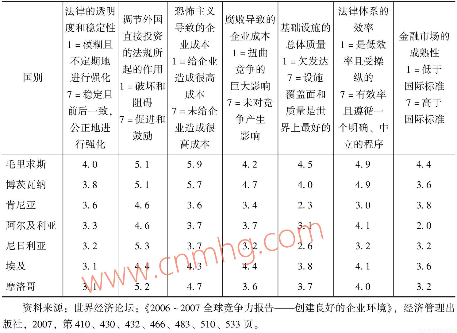 莫塞斯·意凱拉(Moses M.Ikiara,2003)將2000~2003年各研究人員及國際機構對非洲FDI決定因素的調查結果綜合起來并得出結論:具有國內市場容量大、經濟增長率高、投資回報率高、貿易開放程度高、進入地區(qū)市場的潛力大、政治經濟形勢預期良好等特點的非洲國家具有廣闊的投資前景。[1]具體來說,可以優(yōu)先選擇經濟發(fā)展、商業(yè)環(huán)境和全球競爭力位居非洲前列的國家。