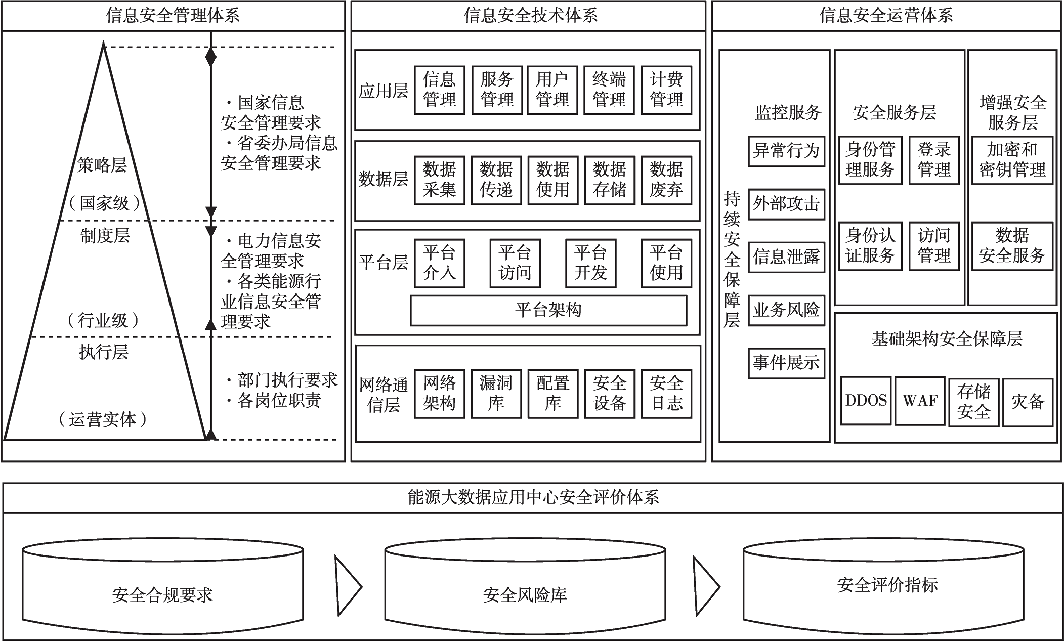能源大數(shù)據(jù)應(yīng)用中心以數(shù)據(jù)為防護(hù)核心,以“防范風(fēng)險、保障合規(guī)、支撐生態(tài)”為建設(shè)目標(biāo),依據(jù)《網(wǎng)絡(luò)安全等級保護(hù)條例》最新要求,參考大數(shù)據(jù)安全能力成熟度模型,分別從管理、技術(shù)、運營、評價四方面開展能源大數(shù)據(jù)應(yīng)用中心安全防護(hù)體系建設(shè)。