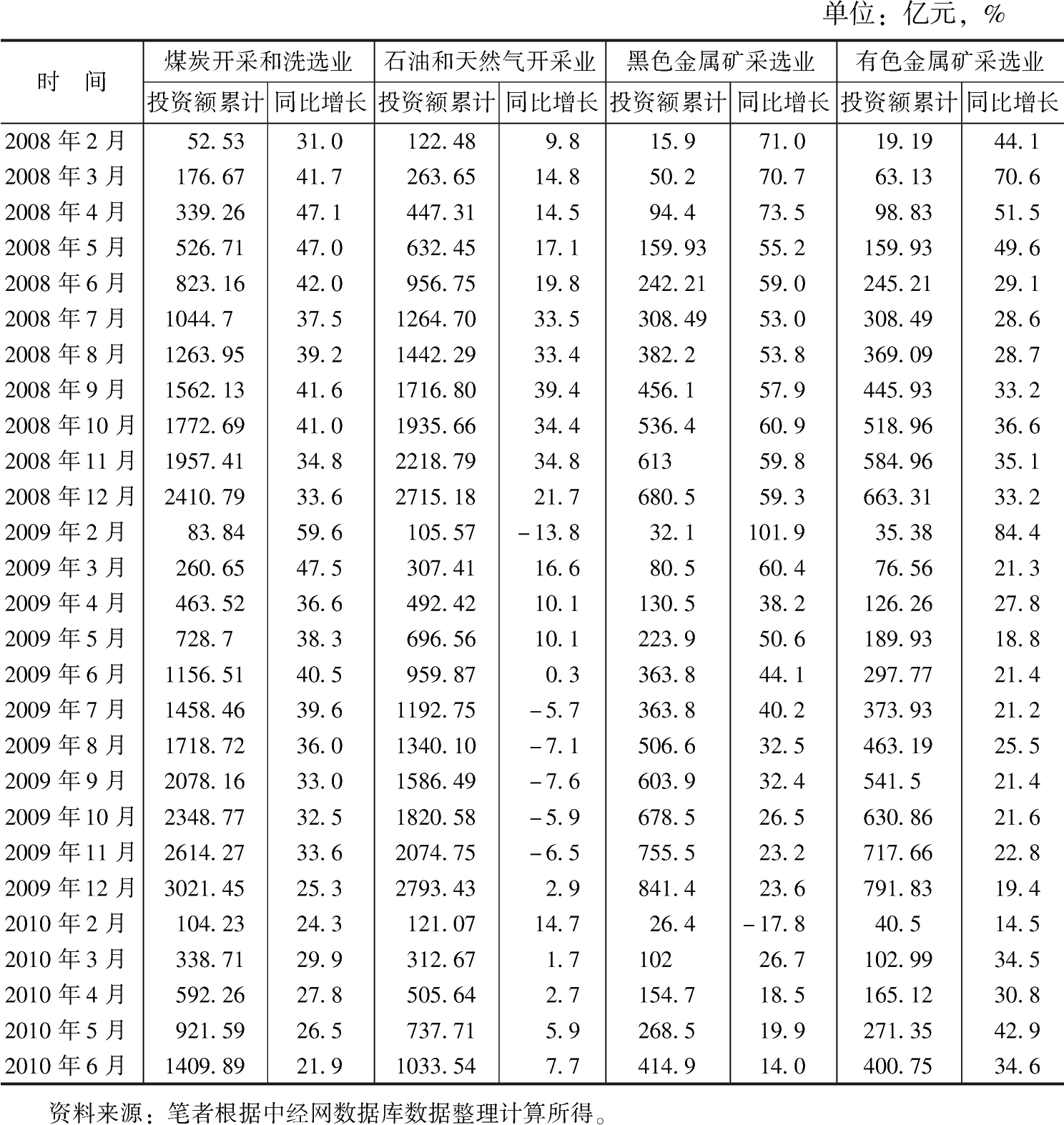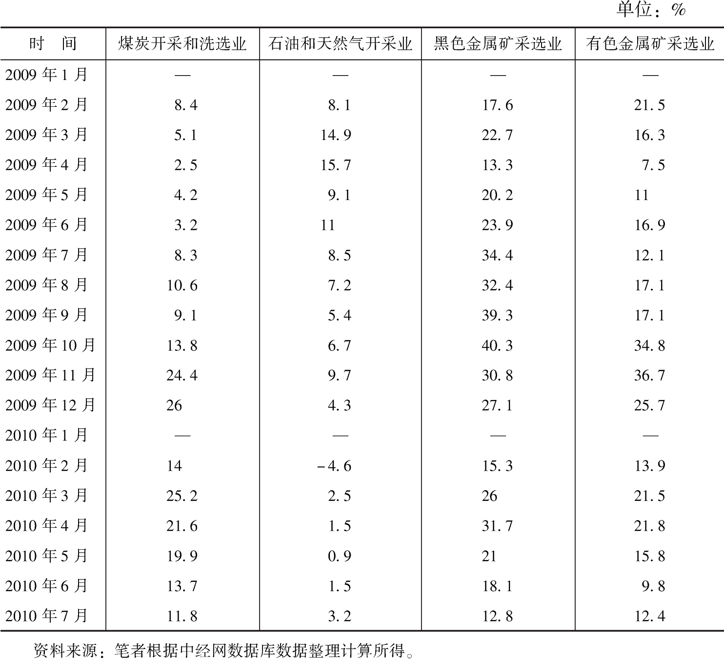 表4-6 2008年以來我國采掘業(yè)各子行業(yè)主營業(yè)務(wù)收入及其累計增速