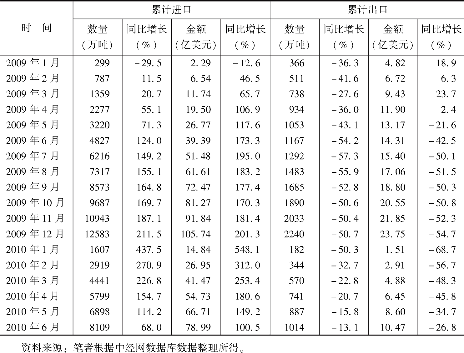 2009年,我國繼續(xù)保持貿(mào)易逆差,是石油凈進(jìn)口國,原油凈進(jìn)口19872萬噸,貿(mào)易逆差為871億美元。1~12月,我國原油累計進(jìn)口20379萬噸,同比增長13.9%,增幅較上年同期提高了4.3個百分點(diǎn),累計進(jìn)口金額為892.56億美元,同比下降31.0%,增幅較上年同期回落了93.1個百分點(diǎn);原油累計出口507萬噸,同比增長21.9%,增幅較上年同期提升了15.0個百分點(diǎn),累計出口金額為21.56億美元,同比下降27.6%,增幅較上年同期減緩了104.2個百分點(diǎn)(見表4-5)。2010年1~6月,我國石油進(jìn)口數(shù)量和金額迅速增加,增幅較上年同期均有大幅提高,出口數(shù)量和金額同比均呈現(xiàn)出下降趨勢。