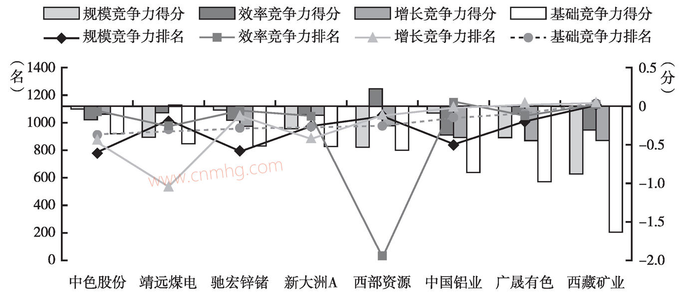 第四組有煤氣化、中色股份、靖遠(yuǎn)煤電、馳宏鋅鍺、新大洲A、西部資源、中國鋁業(yè)、廣晟有色(ST有色)、西藏礦業(yè)9家企業(yè),綜合競爭力得分區(qū)間為-1.6298~-0.2664,平均得分為-0.7222。本組企業(yè)的基礎(chǔ)競爭力和動態(tài)競爭力得分均為負(fù)值,排名均遠(yuǎn)低于全行業(yè)平均水平,企業(yè)規(guī)模比較小,抗風(fēng)險能力差,成長性差,勞動生產(chǎn)率低,導(dǎo)致本組企業(yè)綜合競爭力很弱,排名處于下游。