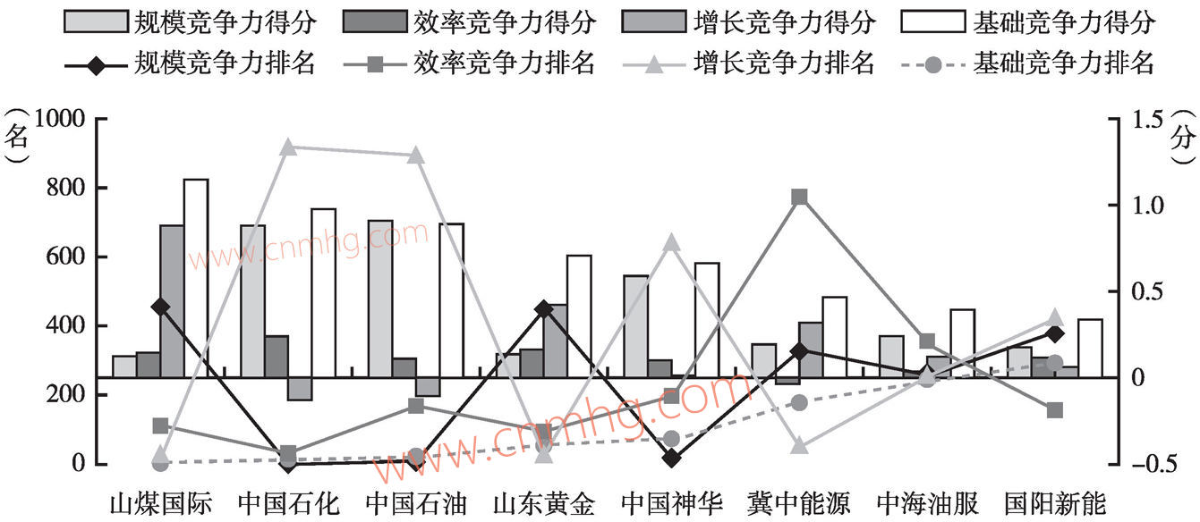 最后,就企業(yè)增長競爭力來看,企業(yè)增長競爭力得分和排名可以分為兩個梯次。山煤國際、山東黃金、冀中能源和中海油服位列第一梯次,排名進(jìn)入前300名以內(nèi),除了中海油服增長競爭力排名在第252位,其他3家企業(yè)的排名均進(jìn)入前50名;中國石化、中國石油、國陽新能、中國神華則排名相對靠后,處于第二梯次。