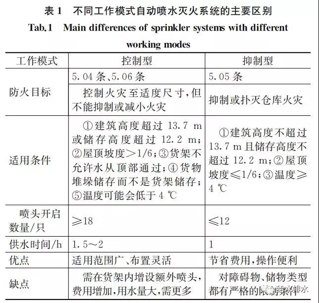 根據(jù)“規(guī)范”的規(guī)定,目前用于倉(cāng)庫(kù)的噴頭類型主要有標(biāo)準(zhǔn)覆蓋面積灑水噴頭、早期抑制快速響應(yīng)噴頭和特殊應(yīng)用噴頭,“規(guī)范”5.0.4、5.0.5和5.0.6條分別是以這3種噴頭為基礎(chǔ)確定的設(shè)計(jì)參數(shù)。3種噴頭的設(shè)計(jì)理念和動(dòng)作性能完全不同,也代表了以這3種噴頭為基礎(chǔ)的3種系統(tǒng)(見(jiàn)表1)。