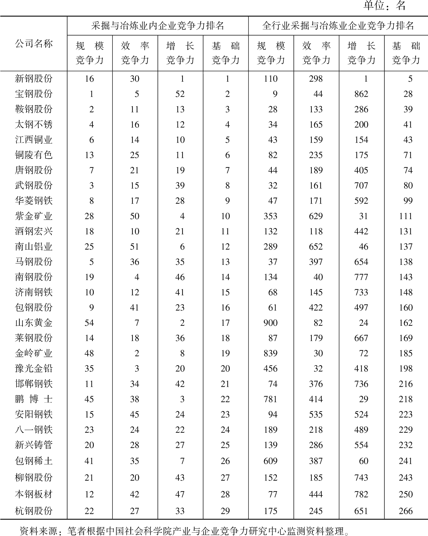 接下來以新鋼股份等部分企業(yè)為例分析本組企業(yè)競爭力變動的情況。如表4-3所示,新鋼股份盡管在規(guī)模競爭力和效率競爭力沒有進入全行業(yè)前100名,但由于在增長競爭力的強勁表現(xiàn),使得其在全行業(yè)的基礎(chǔ)競爭力排名處于第5位,行業(yè)內(nèi)居第1位,其競爭力較強的一個主要原因在于其充分進行市場細分,發(fā)揮專業(yè)化優(yōu)勢。2007年新鋼股份完成整體上市以來,公司始終都占據(jù)所在細分領(lǐng)域的優(yōu)勢,充分保持經(jīng)營靈活性,積極開拓市場,使得公司近兩年實現(xiàn)超速增長,2008年、2009年主營收入和凈利潤分別連續(xù)保持了294%、260%和128%、130%的增長。寶鋼股份則是其國內(nèi)鋼鐵行業(yè)龍頭,規(guī)模在鋼鐵行業(yè)內(nèi)居首位,產(chǎn)品結(jié)構(gòu)完善,部分產(chǎn)品生產(chǎn)工藝水平位居國內(nèi)領(lǐng)先,近年來,公司努力擴大高端產(chǎn)品比例,提升了自身的核心競爭力,然而,公司在增長競爭力方面表現(xiàn)比較差,在全行業(yè)的排名居于第862位,制約了其基礎(chǔ)競爭力的提升。山東黃金與金嶺礦業(yè)在效率競爭力和增長競爭力都進入了全行業(yè)前100名,但由于規(guī)模競爭力排名靠后,制約了公司基礎(chǔ)競爭力排名的提升;紫金礦業(yè)與南山鋁業(yè)等8家企業(yè)則分別有一項指標(biāo)進入前100名,但在另外兩個指標(biāo)上稍微靠后,影響其基礎(chǔ)競爭力排名的提高;八一鋼鐵、柳鋼股份等企業(yè)則分別在規(guī)模競爭力和效率競爭力表現(xiàn)尚可,增長競爭力處于400名以后,盡管存在缺陷,但其基礎(chǔ)競爭力仍可穩(wěn)處中上游水平。
