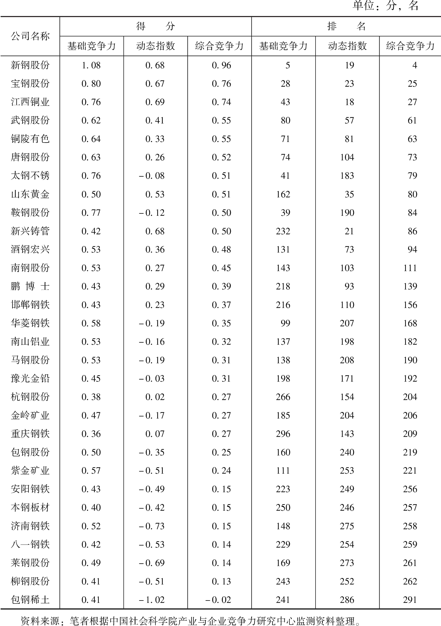 表4-5 滬深兩市主板300強中采掘與冶煉行業(yè)企業(yè)綜合競爭力得分與排名