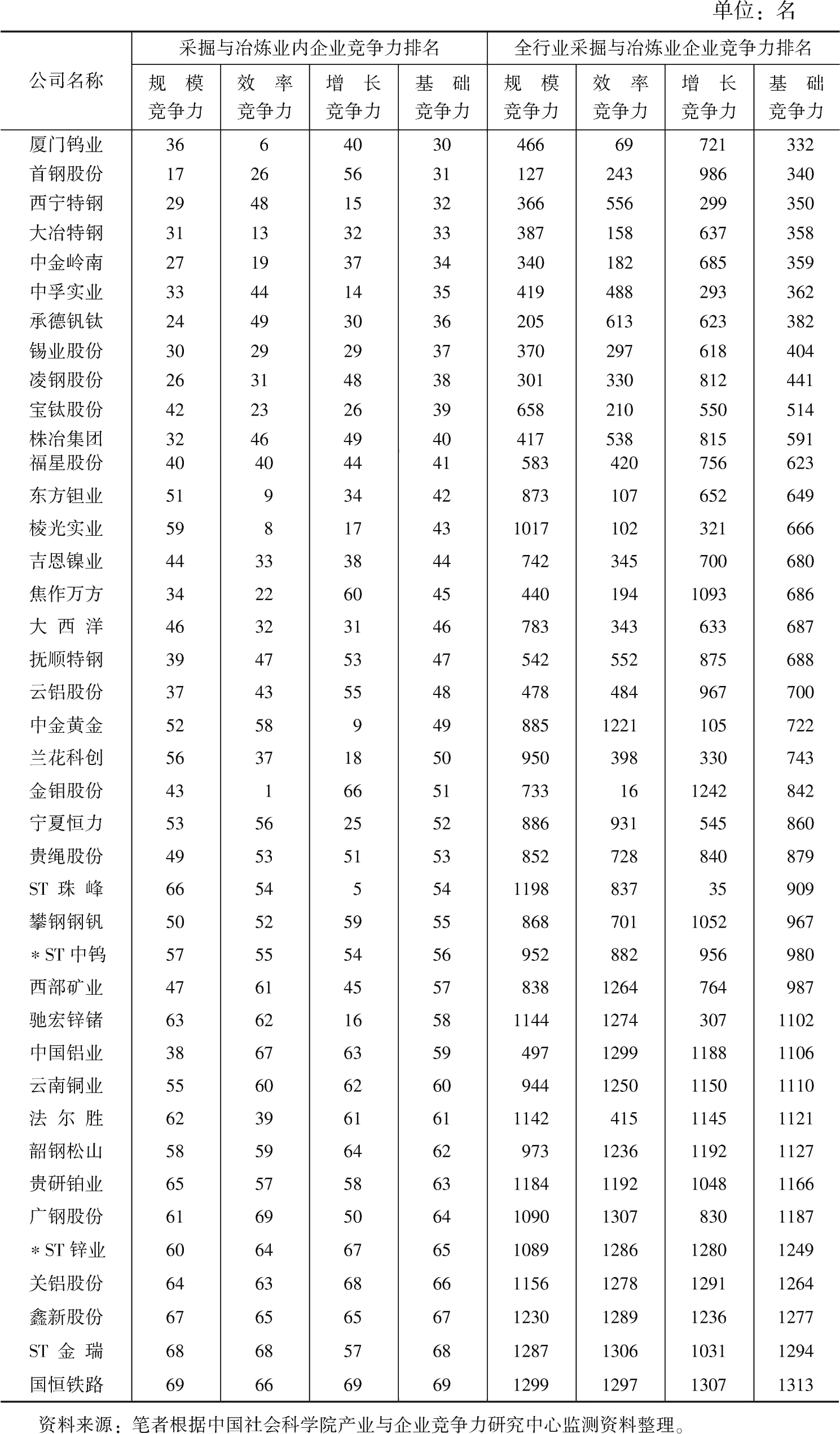 處于第二組的企業(yè)有40家,它們在全行業(yè)的基礎(chǔ)競爭力排名在第332名到第1313名之間。除了廈門鎢業(yè)、金鉬股份兩家企業(yè)在效率競爭力排名以及ST珠峰在增長競爭力排名進入前100名,所有企業(yè)都有兩項或兩項以上指標(biāo)處于200名以后,部分指標(biāo)遠低于全行業(yè)平均水平,例如,除了ST珠峰,幾乎所有的企業(yè)的增長競爭力都表現(xiàn)不佳,導(dǎo)致這些企業(yè)的競爭力處于全行業(yè)300名以后,特別是在本組40家企業(yè)中,竟有33家企業(yè)處于全行業(yè)基礎(chǔ)競爭力400名以后。