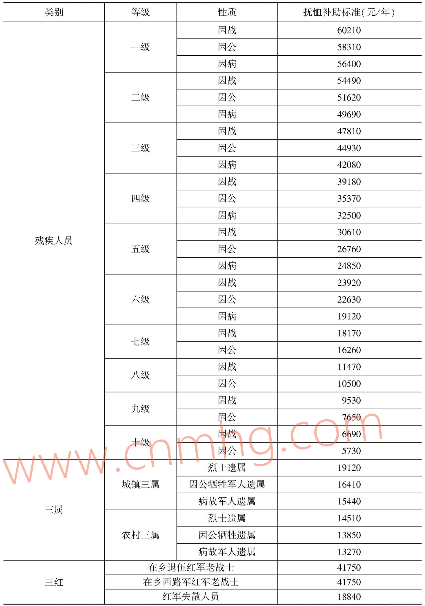 為進(jìn)一步提高優(yōu)撫對(duì)象生活保障水平,按照自然增長(zhǎng)機(jī)制要求,民政部、財(cái)政部從2015年10月1日起再次大幅提高部分優(yōu)撫對(duì)象等人員撫恤和生活補(bǔ)助標(biāo)準(zhǔn)。傷殘人員殘疾撫恤金標(biāo)準(zhǔn)、城鎮(zhèn)“三屬”定期撫恤金標(biāo)準(zhǔn)、“三紅”生活補(bǔ)助標(biāo)準(zhǔn)提高15%,農(nóng)村“三屬”定期撫恤金標(biāo)準(zhǔn)提高30%,在鄉(xiāng)老復(fù)員軍人中央財(cái)政補(bǔ)助標(biāo)準(zhǔn)每人每年提高2400元,烈士老年子女中央財(cái)政補(bǔ)助標(biāo)準(zhǔn)每人每年提高1200元,帶病回鄉(xiāng)退伍軍人補(bǔ)助標(biāo)準(zhǔn)每人每月提高50元、參戰(zhàn)參試人員補(bǔ)助標(biāo)準(zhǔn)每人每月提高100元,農(nóng)村籍老義務(wù)兵每服一年義務(wù)兵役每月增加補(bǔ)助5元。各類優(yōu)撫對(duì)象平均提標(biāo)幅度達(dá)20%以上。這是自改革開放以來,國(guó)家第22次提高傷殘人員殘疾撫恤金標(biāo)準(zhǔn),第25次提高“三屬”定期撫恤金標(biāo)準(zhǔn)和“三紅”生活補(bǔ)助標(biāo)準(zhǔn),也是近年來優(yōu)撫對(duì)象提標(biāo)幅度最大的一次。這對(duì)于保障優(yōu)撫對(duì)象與廣大人民群眾一道奔小康、共享經(jīng)濟(jì)社會(huì)發(fā)展成果具有重要意義。優(yōu)撫對(duì)象中央財(cái)政撫恤補(bǔ)助標(biāo)準(zhǔn)具體見表10-1。