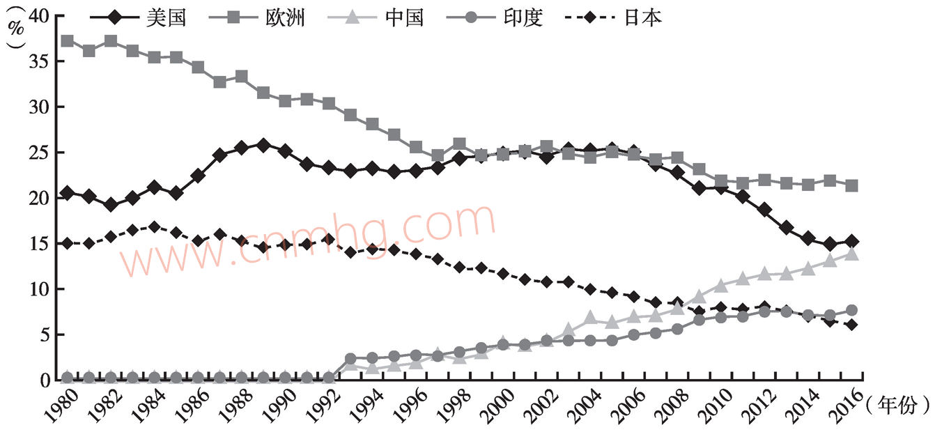 美國(guó)支撐美元體系主要依賴(lài)于其龐大的國(guó)內(nèi)經(jīng)濟(jì)規(guī)模,特別是進(jìn)口能力,包括對(duì)能源的進(jìn)口。這一點(diǎn)與英國(guó)的英鎊地位、英國(guó)的貿(mào)易占全球貿(mào)易的比重在歷史上的發(fā)展軌跡是一樣的。發(fā)達(dá)國(guó)家突出的工業(yè)發(fā)展水平使全球能源貿(mào)易流向呈現(xiàn)出非常典型的南方出口、北方進(jìn)口這種傳統(tǒng)模式。如圖5-1所示,盡管從趨勢(shì)上看,發(fā)達(dá)國(guó)家的原油進(jìn)口占比自20世紀(jì)80年代以來(lái)基本呈下降態(tài)勢(shì),但是其占據(jù)絕對(duì)份額的地位仍未有根本改變。1980~1990年,歐洲地區(qū)國(guó)家、美國(guó)、日本的原油進(jìn)口總量占全球原油進(jìn)口的比重均在70%以上。進(jìn)入90年代以后,發(fā)達(dá)國(guó)家占比顯著下降,至2006年時(shí)跌破60%。2006~2016年,發(fā)達(dá)國(guó)家占比再度下降15個(gè)百分點(diǎn)。作為發(fā)展中國(guó)家的代表,中國(guó)和印度的原油進(jìn)口總量占全球原油進(jìn)口的比重自20世紀(jì)90年代以來(lái)一直呈上升態(tài)勢(shì)。即便如此,兩國(guó)2016年合計(jì)占比也未超過(guò)22%,大體上只相當(dāng)于美國(guó)、日本、歐洲總量的一半。圖5-1還表明,美國(guó)的原油進(jìn)口模式不同于歐洲和日本,在歐洲和日本為應(yīng)對(duì)石油危機(jī),減少石油進(jìn)口,推動(dòng)能源消費(fèi)結(jié)構(gòu)轉(zhuǎn)型時(shí),美國(guó)卻長(zhǎng)期保持了石油進(jìn)口占比的穩(wěn)定。在這背后不難看到金融利益集團(tuán)的身影。圖5-1顯示的另一個(gè)趨勢(shì)是,中國(guó)的原油進(jìn)口占比已經(jīng)十分接近于美國(guó)。如果全球進(jìn)行一場(chǎng)石油美元的變革,那么最有力的替代者將是中國(guó)。