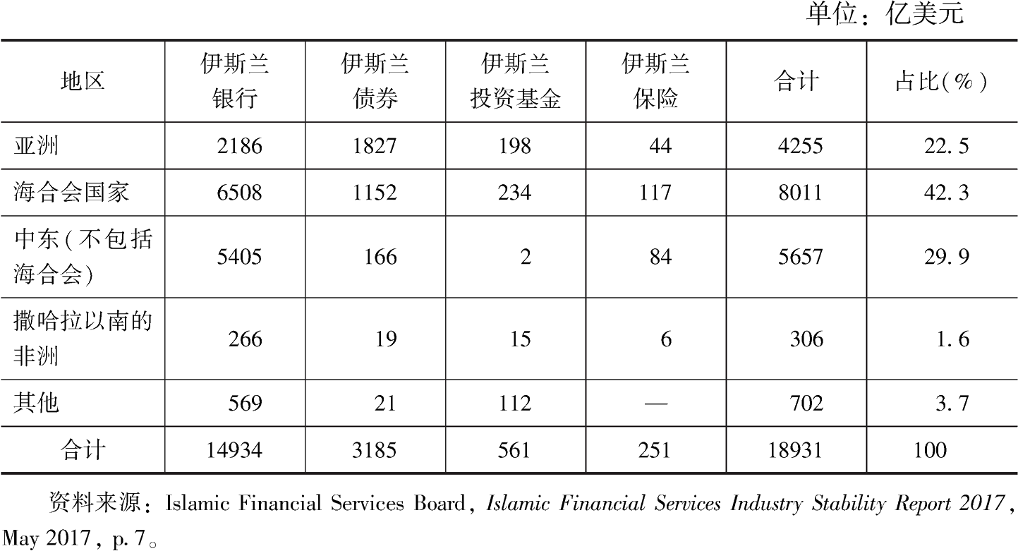 第二,伊斯蘭金融在全球金融資產(chǎn)中已經(jīng)成為一支重要力量。截至2013年,伊斯蘭金融資產(chǎn)約占全球金融總資產(chǎn)的1%。[14]按照2017年版的《伊斯蘭金融穩(wěn)定報(bào)告》,如表5-3所示,目前世界各地區(qū)的伊斯蘭金融資產(chǎn)總額接近1.9萬(wàn)億美元,其中伊斯蘭銀行資產(chǎn)接近1.5萬(wàn)億美元,伊斯蘭債券資產(chǎn)接近3200億美元。各地區(qū)中,中東地區(qū)伊斯蘭金融資產(chǎn)的占比為72.2%,亞洲地區(qū)(不包括西亞)占22.5%,歐美和澳大利亞約占3.7%,撒哈拉以南的非洲約占1.6%。
