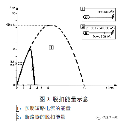 圖2 脫扣能量示意 1:預期短路電流的能量 2:斷路器的脫扣能量 |