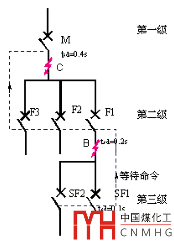圖3為區(qū)域聯鎖選擇性保護的工作原理圖。圖中配電系統(tǒng)為三級保護(注意!保護級數不同于配電級數),第二級斷路器F1,F2,F3和第一級主斷路器M之間形成聯鎖,第三級斷路器SF1,SF2和其上級斷路器F1之間形成聯鎖(如圖中虛線所示)。假設M、F1、SF1三級斷路器的延時時間分別為0.4s,0.2s,0.1s。