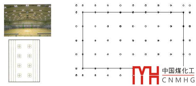 頂部布置是燈具布置在場地上方,光束垂直于場地平面的布置方式。頂部布置宜選用對稱型配光的燈具,適用于主要利用低空間,對地面水平照度均勻度要求較高,且無電視轉(zhuǎn)播要求的體育館。一般訓(xùn)練館、全民健身用的體育館可采用頂部布燈方式。
