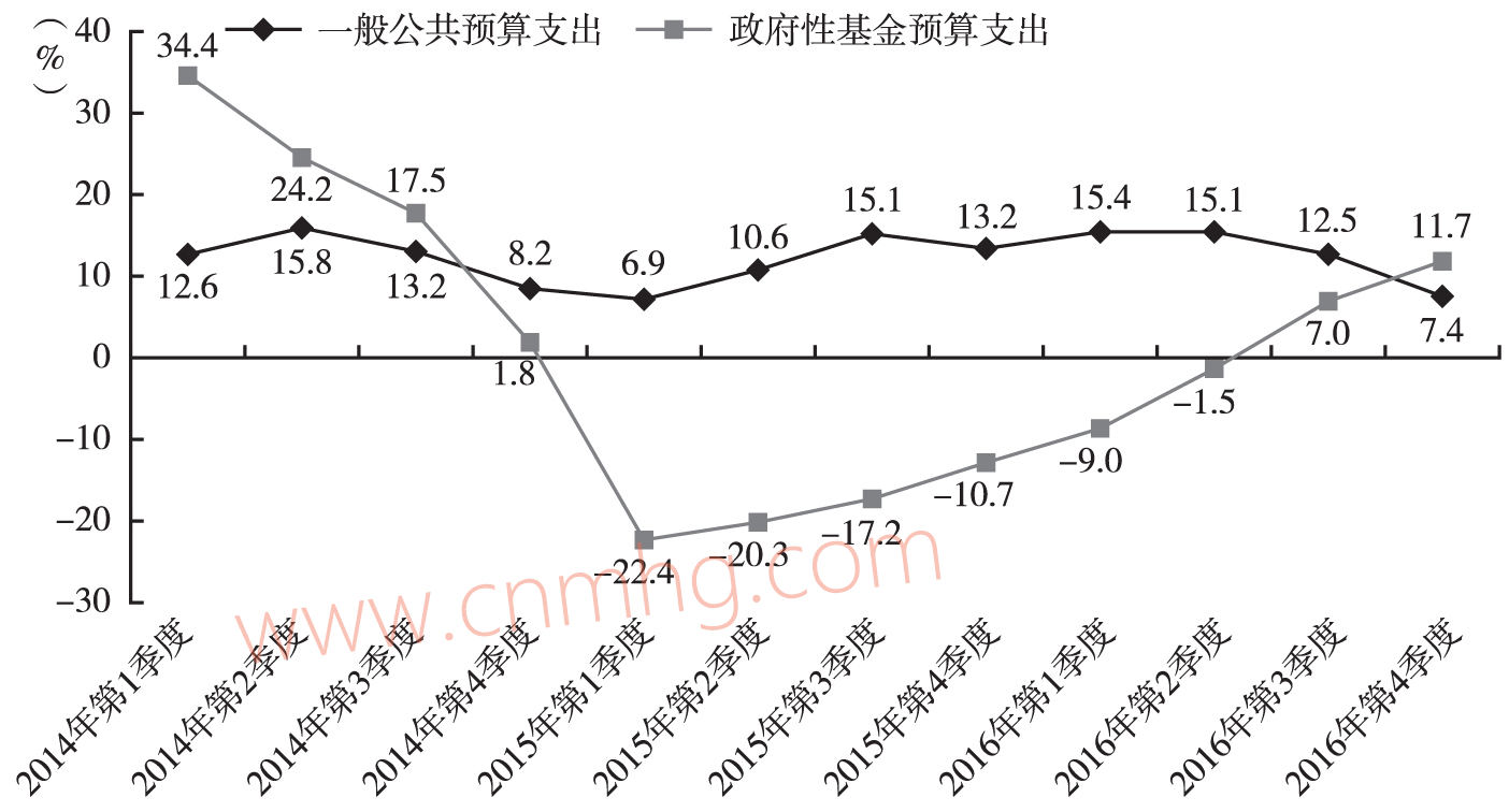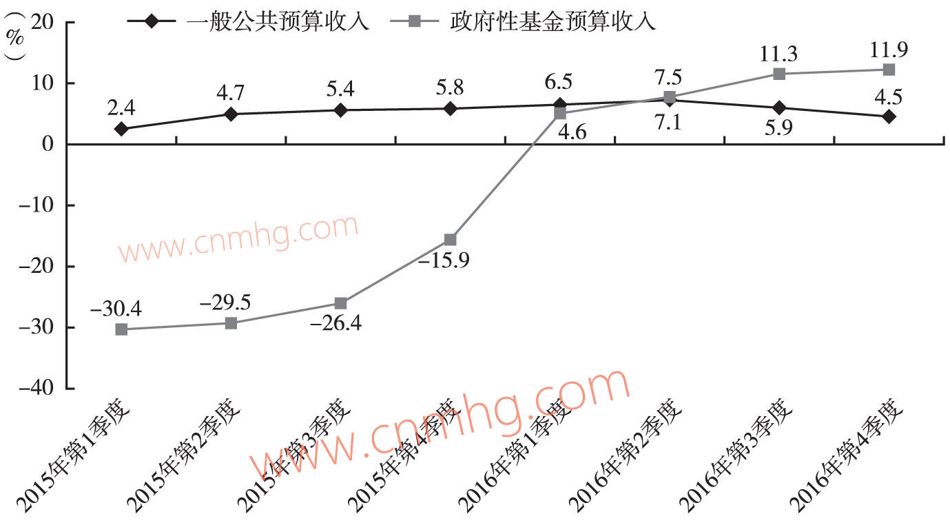 從收入增長情況看,全年一般公共預(yù)算收入增速與政府性基金預(yù)算收入也呈反向變動(dòng)趨勢,前者逐季下降,后者逐季上升,收入的增長較好地呼應(yīng)了支出的增長,如圖2所示。2016年我國一般公共預(yù)算收入增速為自1988年以來的最低增速,政府性基金預(yù)算收入累計(jì)增速雖沒有延續(xù)前三季度跨越式增長的趨勢,但仍呈持續(xù)攀升勢頭。