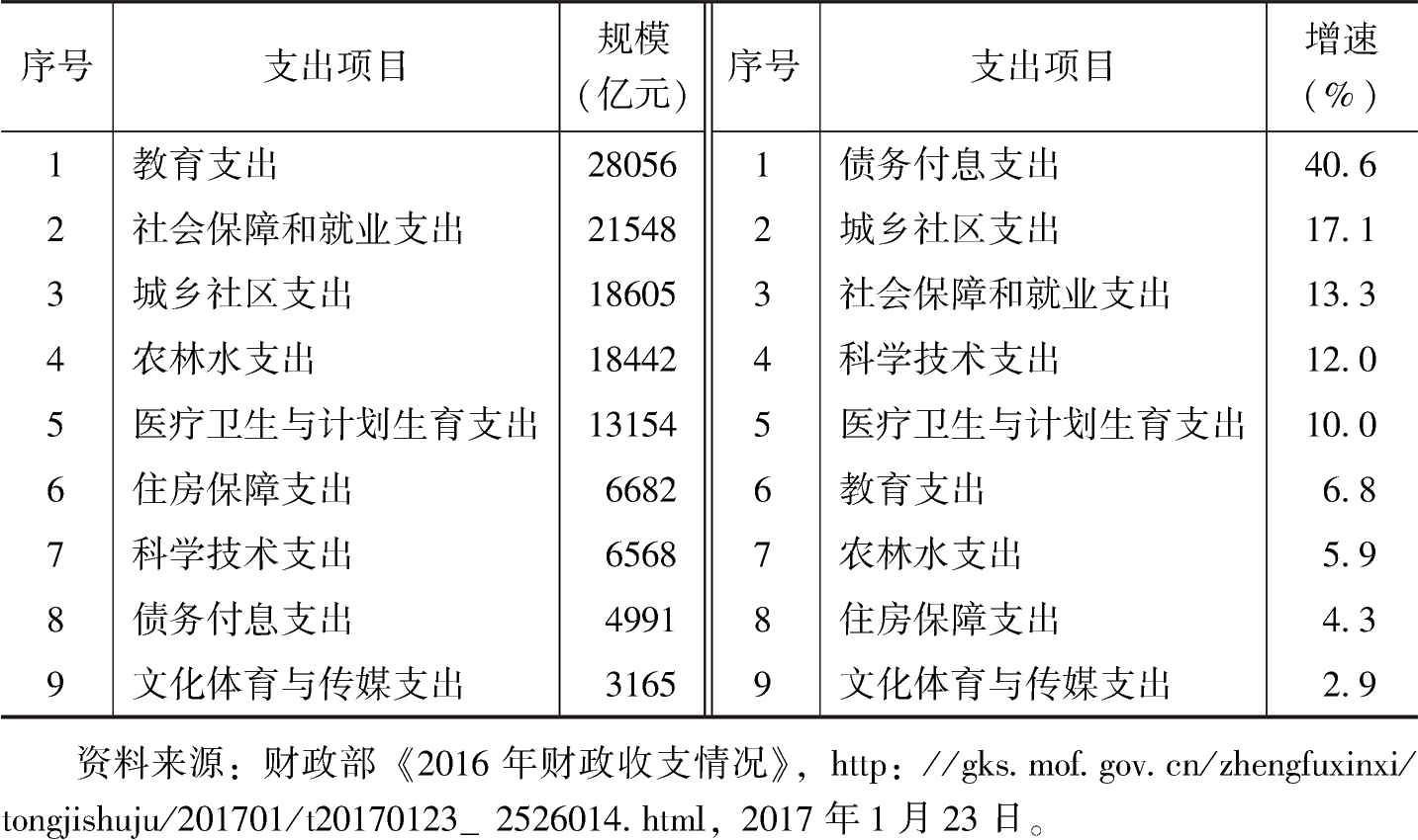 表3 2016年我國一般公共預(yù)算重點(diǎn)支出規(guī)模和增速排序