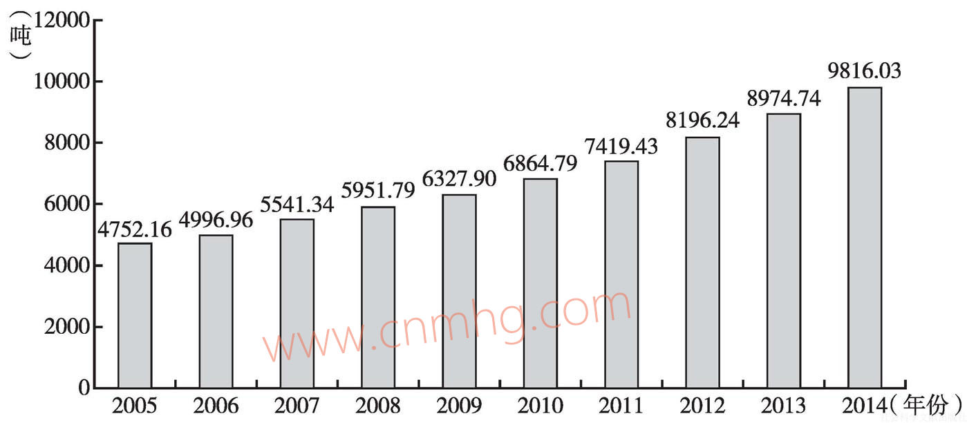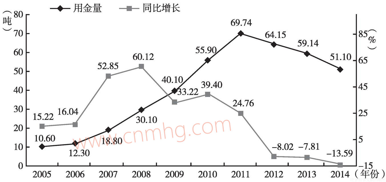 圖8 2005~2014年我國(guó)黃金加工規(guī)模變化