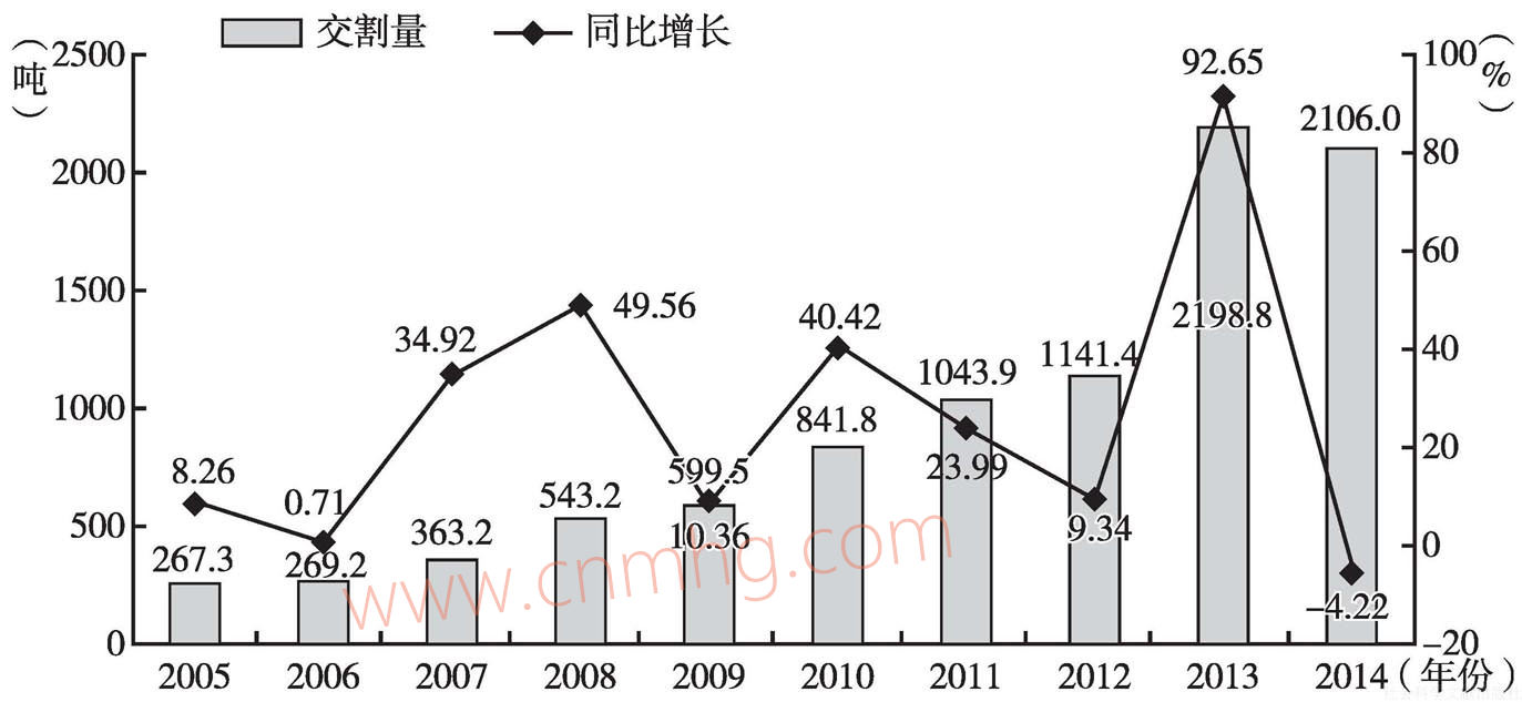 圖11 2005~2014年黃金交割量變化