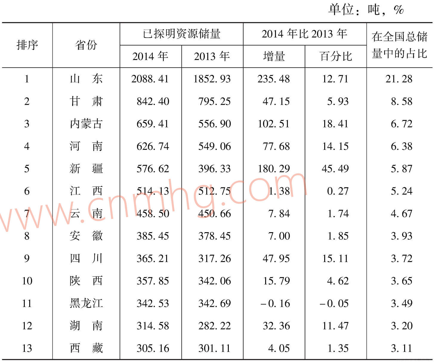 儲(chǔ)量300噸以上的省份總計(jì)有13個(gè),總計(jì)儲(chǔ)量約7837.00噸,占全國(guó)總儲(chǔ)量的近八成(79.84%)。與五年前的2009年相比,新疆是資源儲(chǔ)量增長(zhǎng)最快的地區(qū),五年間增長(zhǎng)384.15%,因而在全國(guó)的排序由第20位上升到第5位,上升了15位,而增長(zhǎng)量第一的當(dāng)屬山東,增長(zhǎng)了1184.81噸,連上兩個(gè)千噸臺(tái)階,達(dá)到2088.41噸。儲(chǔ)量增長(zhǎng)較快的還有湖南,五年增長(zhǎng)了1.01倍,排序由第17位上升到第12位,提升了5位。