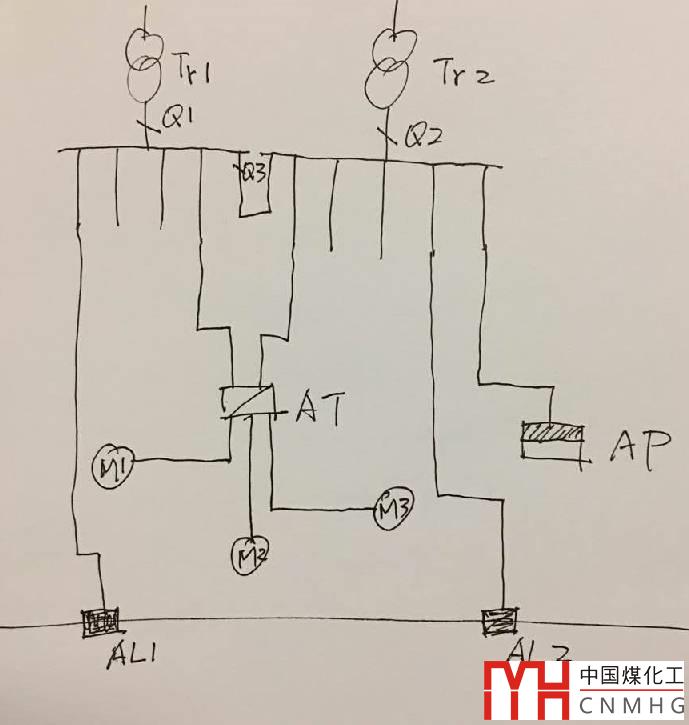 如圖1所示,兩個(gè)變壓器Tr1、Tr2可以認(rèn)為是電源,斷路器Q3是母聯(lián),從Tr1、Tr2各引一路至雙電源切換箱AT,再由AT箱向二級(jí)負(fù)荷配電。