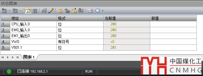 打開狀態(tài)圖表后,可以在里面輸入想監(jiān)控或修改的地址。當(dāng)然,前提是已經(jīng)跟S7-200 SMART CPU建立了連接。比如,下面這張圖是我監(jiān)控的I0.0、I8.0、Q12.0、VW0和V501.1的狀態(tài):