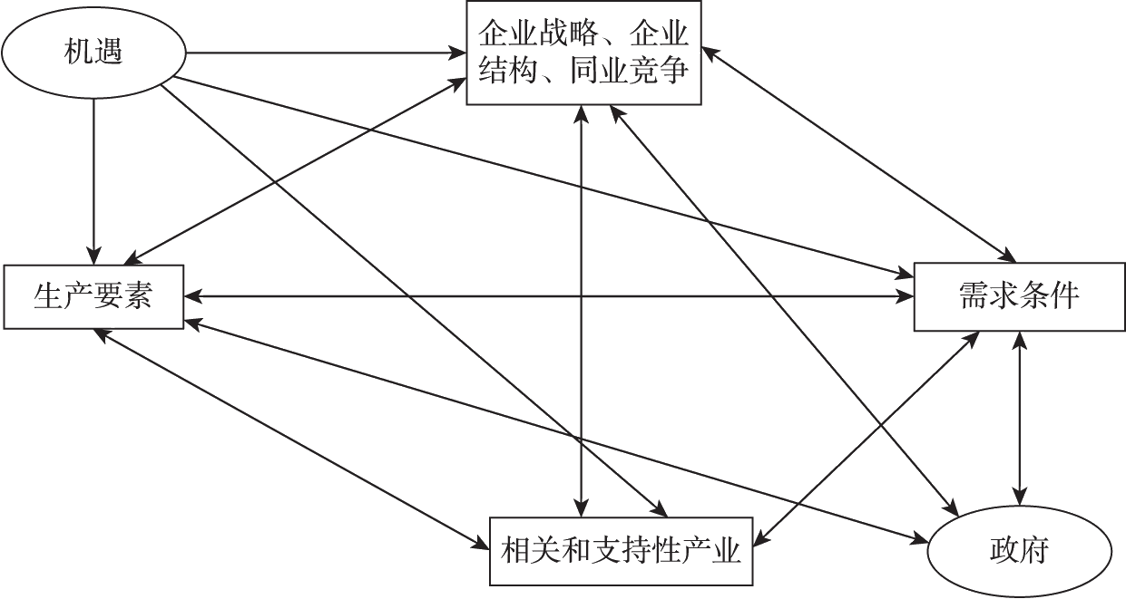 在產(chǎn)業(yè)競爭力方面,比較經(jīng)典的理論來源于美國哈佛商學院教授邁克爾·波特。在著作中,他沒有對“產(chǎn)業(yè)競爭力”進行定義,而是從產(chǎn)業(yè)和企業(yè)的角度去看待國家競爭力的問題。他認為,一個國家是否具有競爭力取決于其產(chǎn)品是否具有競爭力。而國家的宏觀環(huán)境又決定了產(chǎn)業(yè)和企業(yè)的競爭優(yōu)勢。他在《國家競爭優(yōu)勢》一書中對位于10個國家的上百種產(chǎn)業(yè)的發(fā)展歷史進行研究,歸納分析出了國家如何在特定領(lǐng)域建立競爭優(yōu)勢的著名的“鉆石體系”。從產(chǎn)業(yè)競爭優(yōu)勢的形成來看,國際競爭力的形成更依賴于企業(yè)的創(chuàng)新能力和策略行為。在波特的鉆石理論中,“鉆石模型”的形成依賴于六個要素之間的彼此互動。然而,在開放市場的條件下,這六種因素同樣影響著產(chǎn)業(yè)安全。這充分說明了產(chǎn)業(yè)安全和產(chǎn)業(yè)國際競爭方面存在緊密的關(guān)聯(lián)性,所以,解決產(chǎn)業(yè)的安全生存和發(fā)展問題的最主要辦法還是靠產(chǎn)業(yè)國際競爭力的不斷提升。產(chǎn)業(yè)競爭力理論的機理如圖2-5所示。