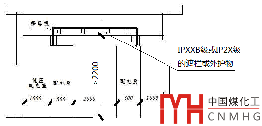 《低壓配電設計規(guī)范》GB50054-2011第4.2.6條規(guī)定,配電室通道上方裸帶電體距地面的高度不應低于2.5m,當?shù)陀?/span>2.5m時應設置不低于現(xiàn)行國家標準《外殼防護等級(IP代碼)》GB 4208規(guī)定的IPXXB級或IP2X級的遮欄或外護物,遮欄或外護物底部距地面的高度不應低于2.2m。