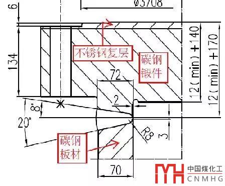 筒體是碳鋼板材,管板是碳鋼鍛件+不銹鋼復(fù)層。由于板材的許用應(yīng)力較高,鍛件許用應(yīng)力較低,其凸肩直邊段按照筒體計(jì)算公式會(huì)比筒體要厚。所以設(shè)計(jì)時(shí)將凸肩的厚度增厚了。
