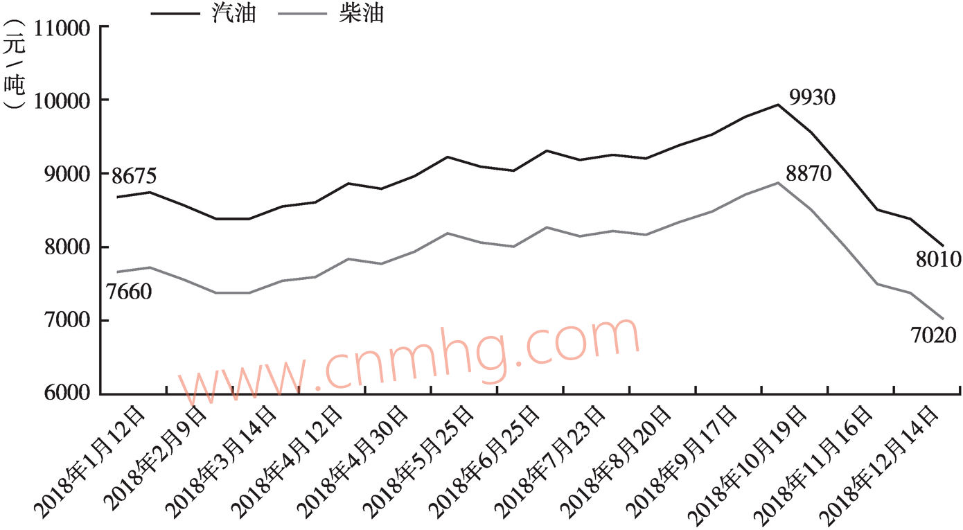 2018年1~9月,受主要產(chǎn)油國持續(xù)減產(chǎn)、中東地區(qū)地緣政治沖突升級、美國原油庫存持續(xù)下降等影響,國際油價(jià)呈現(xiàn)高位震蕩;10月之后,主要受美股下跌影響,國際油價(jià)開始下跌,11月、12月出現(xiàn)大幅下跌。受此影響,國內(nèi)成品油價(jià)格呈波動上揚(yáng)態(tài)勢,10月,河南汽、柴油價(jià)格分別上升至9930元/噸、8870元/噸的年內(nèi)最高點(diǎn)。10月之后,受原油價(jià)格持續(xù)走低影響,國內(nèi)成品油價(jià)格也隨之下調(diào)。12月底,河南汽、柴油價(jià)格分別下調(diào)至8010元/噸、7020元/噸,河南成品油價(jià)格已低于年初水平(見圖4)。