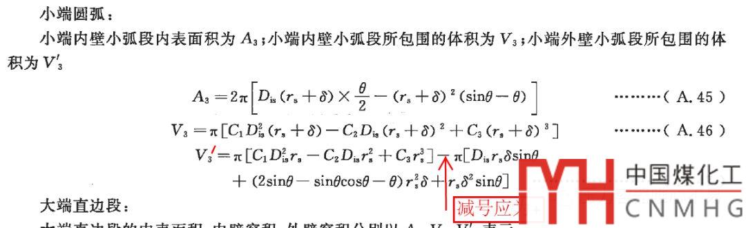 1. 在規(guī)范的第17頁,雙折邊錐形封頭中,小端圓弧的外壁小弧段所包圍的體積V3'公式A.47中的“-”應(yīng)改為“+”(V3也需要改為V3’)。建議修訂時(shí),將此公式修改。