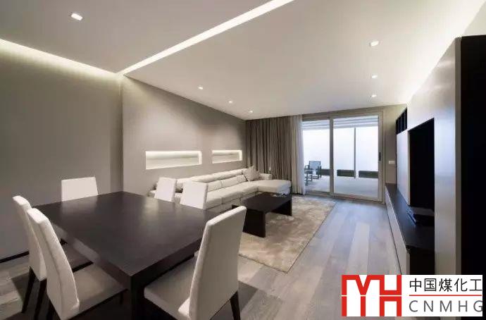 起居室的空間延時到餐廳,室內(nèi)設計風格統(tǒng)一、一致,照明設計也是采用起居室照明的相同手法,餐桌上方的筒燈起到局部照明的作用,增強了餐桌上的照明水平,滿足功能需求。