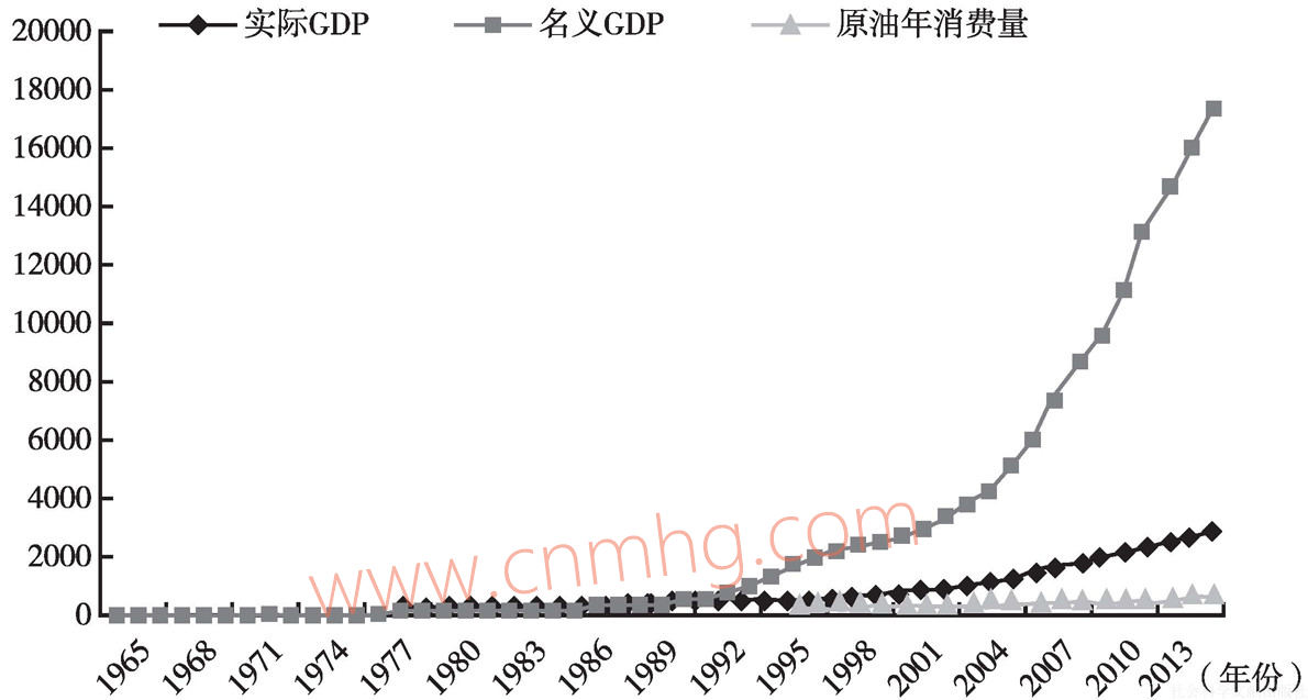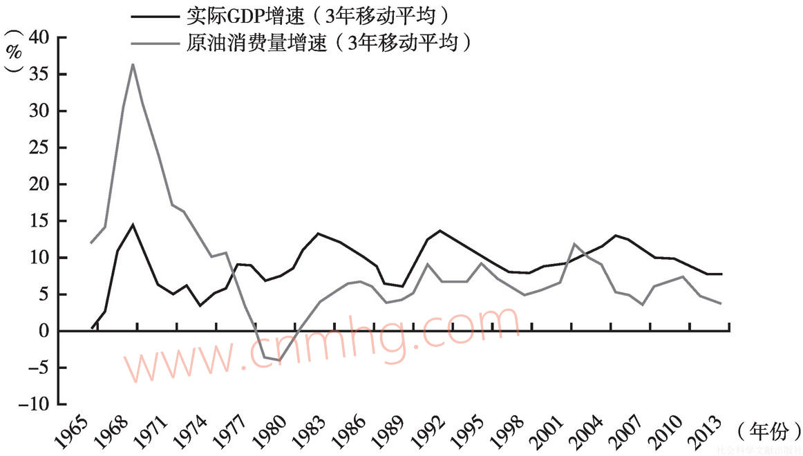 同時(shí),經(jīng)濟(jì)增速與石油消費(fèi)量增速之間也存在短期波動的同向性(見圖3.11)。當(dāng)經(jīng)濟(jì)繁榮、增長速度較快的時(shí)候,石油消費(fèi)量也增長較快;當(dāng)經(jīng)濟(jì)低迷、增速下行的時(shí)候,石油消費(fèi)量的增速也會相應(yīng)下降。