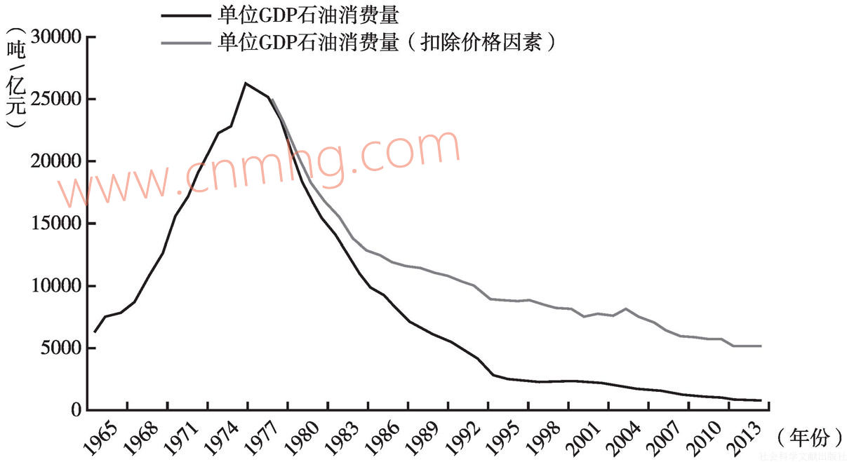 從絕對量上來看,1978年,每1億元GDP對應(yīng)的原油消費(fèi)量約為2.5萬噸,到2014年下降為818噸(見圖3.10)。單位GDP石油消費(fèi)量僅為1978年的1/30。當(dāng)然,這其中價(jià)格因素起了主要作用,因?yàn)樵谶@30多年間不僅實(shí)際產(chǎn)出在增加,整體物價(jià)水平也在高速增長,但是即便扣除價(jià)格因素之后,2014年單位GDP的石油消費(fèi)量也降低到了1978年的1/5左右。