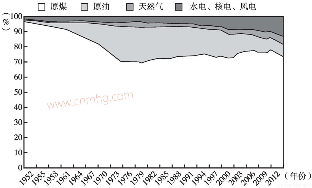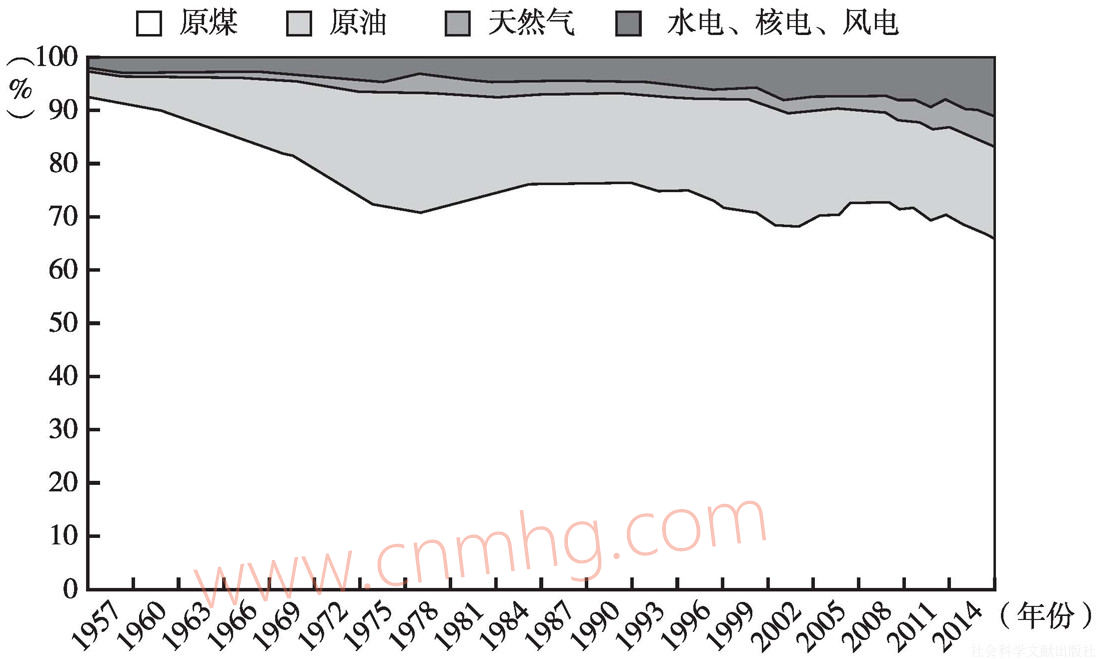 圖3.1 中國一次能源消費(fèi)結(jié)構(gòu)(1957~2014年)