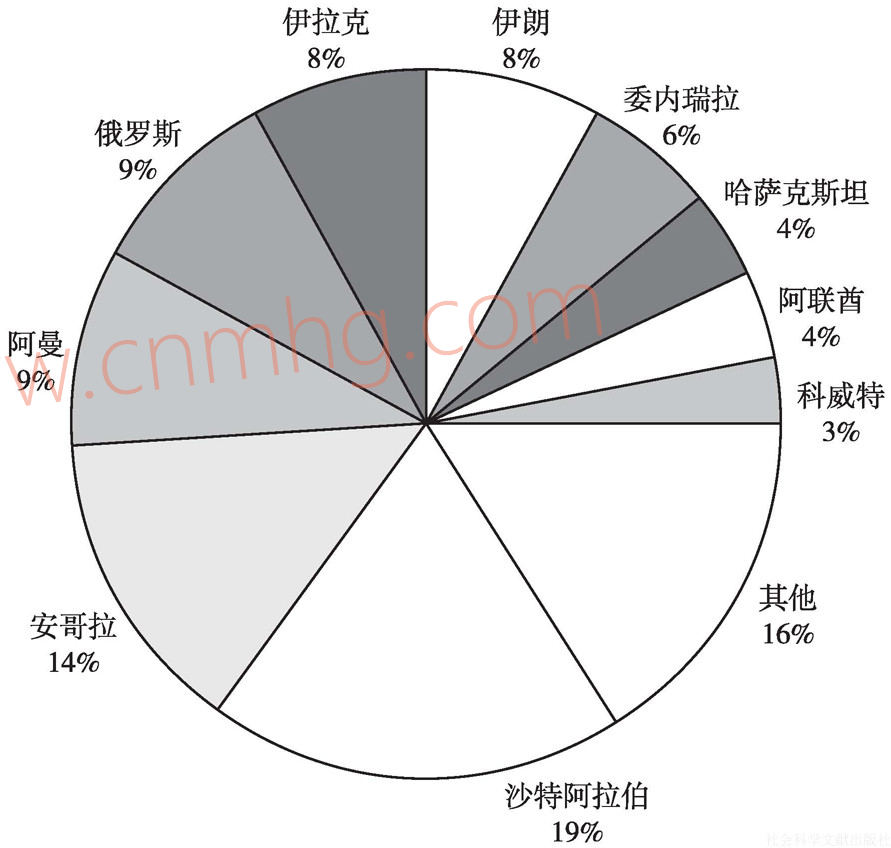 2013年,按照原油進(jìn)口數(shù)量,排在前10位的來源國依次是(見圖3.6):沙特阿拉伯、安哥拉、阿曼、俄羅斯、伊拉克、伊朗、委內(nèi)瑞拉、哈薩克斯坦、阿聯(lián)酋、科威特。其中,來自沙特阿拉伯的原油進(jìn)口占中國進(jìn)口總量的接近1/5,安哥拉占14%,阿曼、俄羅斯、伊拉克和伊朗也分別占總進(jìn)口量的8%~9%(見圖3.7)??梢姡袊鴮ν馐瓦M(jìn)口的集中度非常高,84%的進(jìn)口石油來自上述10個(gè)國家。