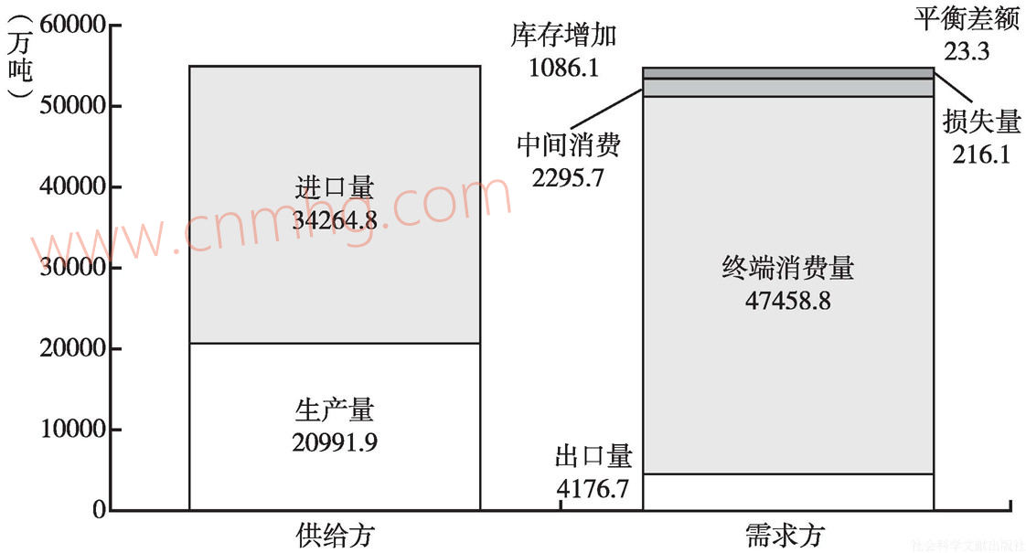 在上述五個(gè)去向之中,后面四個(gè)去向的相對規(guī)模都很有限——出口量約為4177萬噸,中間消費(fèi)約為2296萬噸,庫存增加1086萬噸,損失量為216萬噸,四者加起來相當(dāng)于總供給量的14%。其余的86%被用于終端消費(fèi),總量是4.7億噸。