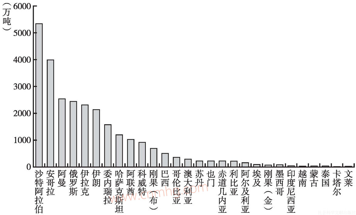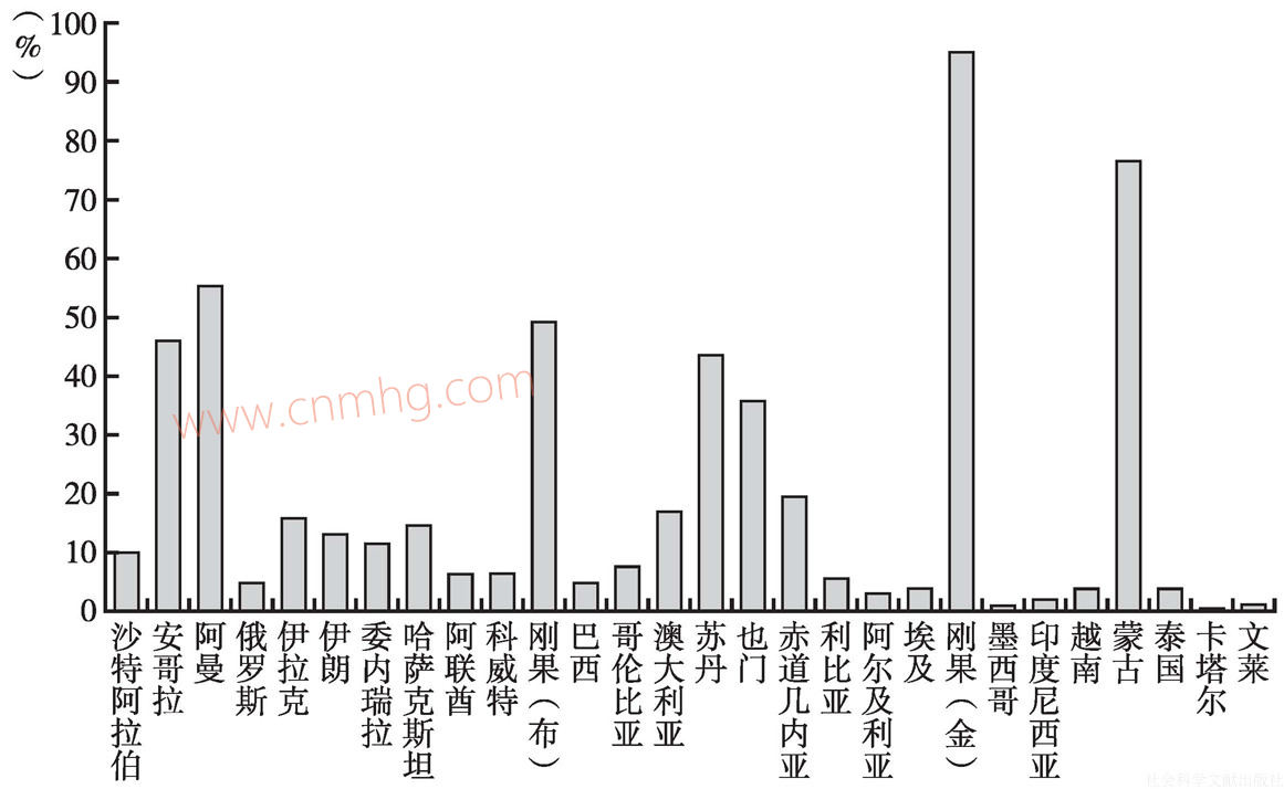 換一個(gè)角度從產(chǎn)油國的立場來看,有些石油出口國對中國市場的依賴度非常高。例如,剛果(金)和蒙古兩國產(chǎn)出的石油中70%出口至中國市場。另外,安哥拉、阿曼、剛果(布)、蘇丹、也門等石油產(chǎn)出國對中國市場的依賴度也比較高(見圖3.8)。即便是沙特阿拉伯和俄羅斯這樣的石油生產(chǎn)巨頭,其對中國市場的依賴度也不低——沙特阿拉伯約1/10的石油總產(chǎn)量出口至中國,俄羅斯約1/5的石油總產(chǎn)量出口至中國。