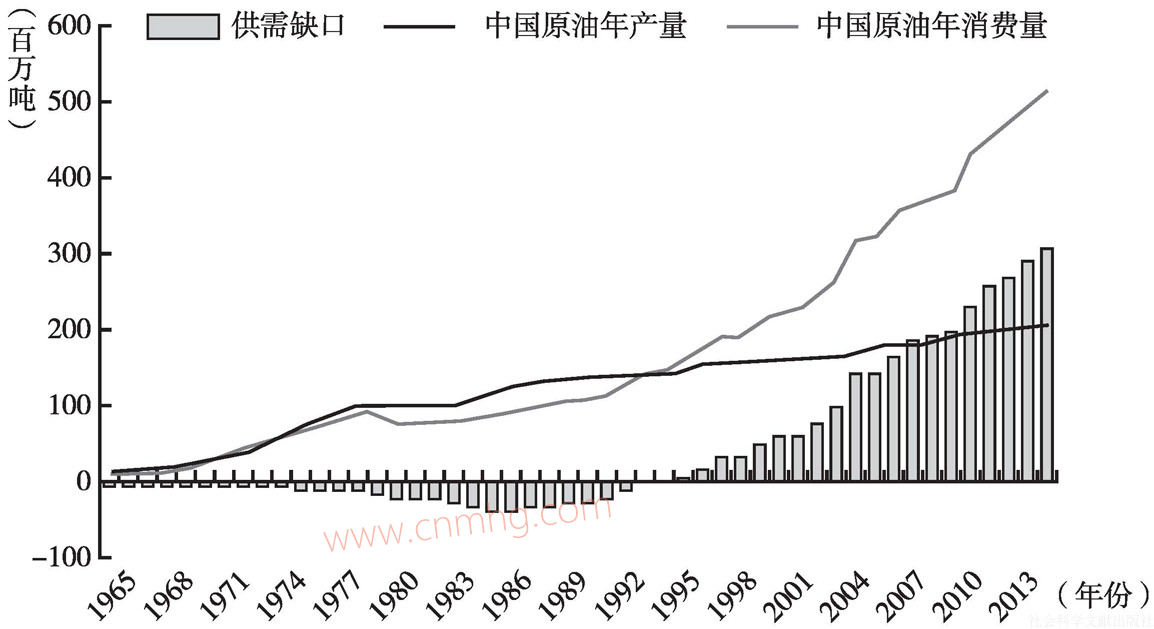 1992年之前,中國國內(nèi)石油產(chǎn)量大于消費(fèi)量,每年有一定的盈余。而在此之后,因?yàn)槭拖M(fèi)的增長速度逐漸超過了國內(nèi)石油產(chǎn)量的增長速度,供需缺口開始不斷拉大(見圖3.3)。1993~2014年,國內(nèi)石油產(chǎn)量的年平均增速僅為1.84%,而石油消費(fèi)量的年平均增速則達(dá)到了6.25%。消費(fèi)量增速比產(chǎn)量增速每年快4.4個(gè)百分點(diǎn)。