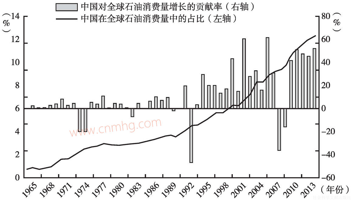 中國經(jīng)濟(jì)的快速增長、對外開放度的不斷提高以及與全球市場的雙向互動也非常典型地反映在國際石油市場上(見圖3.12)。1965年,中國在全球石油消費(fèi)總量中的占比僅為0.72%,1978年改革開放之前也不到3%,但隨著改革開放之后經(jīng)濟(jì)的持續(xù)快速增長,中國石油消費(fèi)量在全球的占比不斷攀升,到2014年上升到了12.35%。也就是說,中國經(jīng)濟(jì)消耗了全球約1/8的石油。在有些年份,來自中國市場的增量需求超過了全球石油增量需求的一半??紤]到將近60%的石油依賴從國外進(jìn)口,中國毫無疑問已經(jīng)成為國際石油市場上舉足輕重的參與方。