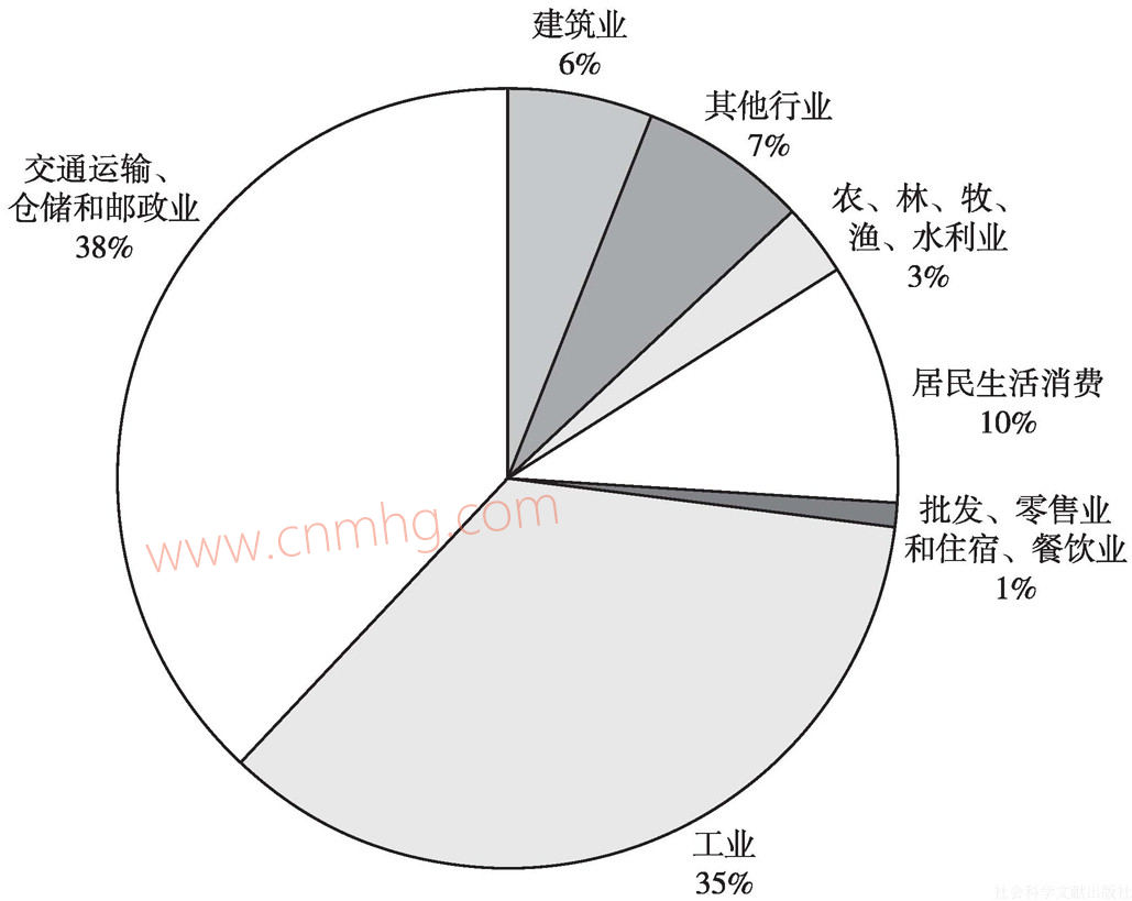 分行業(yè)來看,消費(fèi)石油最多的兩個(gè)行業(yè)(見圖3.5),第一是交通運(yùn)輸、倉儲和郵政業(yè),第二是工業(yè)。這兩者加起來占全部石油消費(fèi)量的73%。另外,居民生活消費(fèi)占10%,建筑業(yè)占6%。