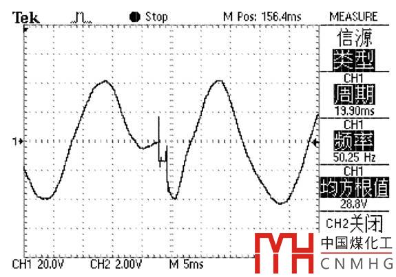 圖1是金鹵燈的熄弧試驗(yàn)波形,左半邊為一電源正常供電,在圖中中間部位電源斷電,切換到另一個(gè)電源(右側(cè)波形),由另一個(gè)電源繼續(xù)供電。電源轉(zhuǎn)換過(guò)程中發(fā)生振蕩。試驗(yàn)表明,金鹵燈的熄弧特性具有非常明顯的不確定性,即使電源轉(zhuǎn)換時(shí)間為3ms也難以保證在電源轉(zhuǎn)換過(guò)程中燈不熄滅!這是由金鹵燈的特性所決定的,一旦金鹵燈熄滅需要先冷卻約10min方可再次啟動(dòng),啟動(dòng)時(shí)間也約10min,這樣會(huì)嚴(yán)重影響金鹵燈持續(xù)照明,在重要場(chǎng)所必需采取相應(yīng)措施。