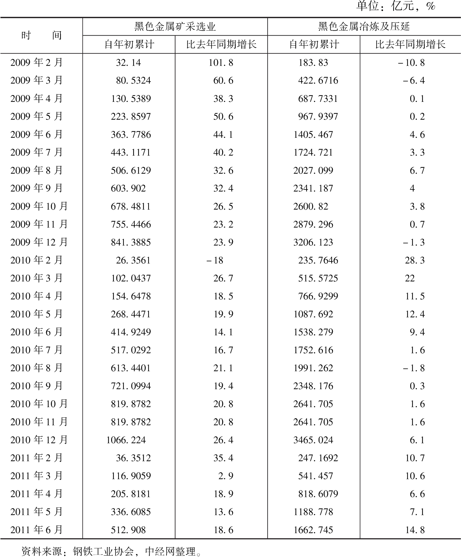 表3-6 2010年以來黑色金屬礦采選業(yè)銷售收入、利潤累計及其累計增速
