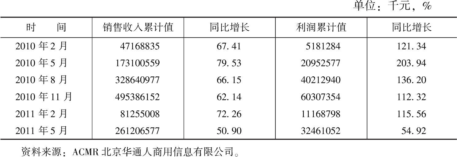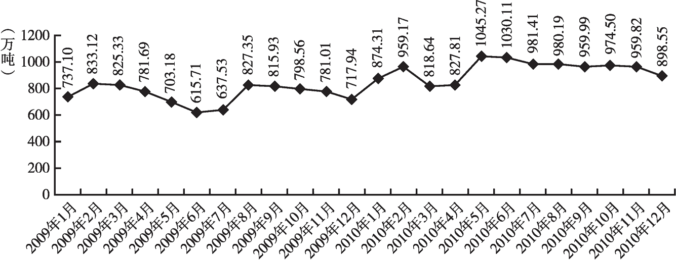 2010年,我國粗鋼產(chǎn)量為62665.4萬噸,同比增長10.36%;生鐵產(chǎn)量為59021.8萬噸,同比增長8.55%;鋼材產(chǎn)量為79627.4萬噸,同比增長15%(表3-1)。2010年,鋼鐵行業(yè)產(chǎn)量增幅明顯放緩,生鐵、粗鋼、鋼材增幅較2009年的15.9%、13.50%和18.50%分別回落7.35、3.14和3.5個百分點(diǎn)。進(jìn)入2011年,鋼鐵產(chǎn)量增幅保持波動中緩慢回升。6月,生鐵和粗鋼產(chǎn)量增幅較2010年末分別上漲1.0和0.3個百分點(diǎn),鋼材產(chǎn)量增幅較2010年末下降1.9個百分點(diǎn),2011年6月生鐵和粗鋼產(chǎn)量的月增幅達(dá)到近一年最高位,而鋼材產(chǎn)量的月增幅最高位出現(xiàn)在2011年2月(表3-2)。2010年10月以來,除個別月份,生鐵和粗鋼的月累計增幅已從十位數(shù)下降至個位數(shù),在2010年的8~9月連續(xù)三個月更是跌至負(fù)增長。究其原因,從2010年4月上旬開始,政府出臺了一系列嚴(yán)厲的房地產(chǎn)調(diào)控政策,而國內(nèi)生產(chǎn)的近50%的建筑鋼材,都是用于房地產(chǎn)市場,由圖3-1可以看出,4月作為2010年鋼鐵產(chǎn)量的第一個轉(zhuǎn)折點(diǎn),產(chǎn)量增速急劇放緩。另一方面,2010年是落實(shí)“十一五”節(jié)能減排目標(biāo)的決戰(zhàn)年,年度減排目標(biāo)要實(shí)現(xiàn)全年下降5.2%,而鋼鐵行業(yè)占我國能源消費(fèi)的1/6~1/5,為確保節(jié)能減排目標(biāo),從8月底開始,河北、江蘇和浙江等地相繼對地區(qū)內(nèi)高耗能鋼鐵企業(yè)進(jìn)行限電限產(chǎn),并逐步向全國蔓延。