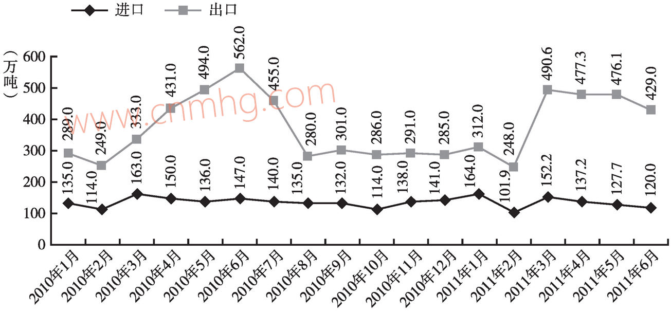 2010年鋼材全年出口4256萬噸,同比增長73.1%。6月份出口鋼材達(dá)到年內(nèi)最高的562萬噸,之后受國際市場鋼材價格由升轉(zhuǎn)降、需求放緩和出口調(diào)控政策的影響,我國鋼材出口迅速回落,8月至年末,月度出口量維持在300萬噸左右。2011年2月創(chuàng)下2010年以來出口248萬噸的新低,隨后3月份鋼材出口強(qiáng)勁反彈至490.6萬噸,之后逐月回落。從上半年看,累計出口鋼材2433萬噸,同比增長3.2%(圖3-3)。2010年,我國鋼材進(jìn)口相對平穩(wěn),共計進(jìn)口1645萬噸,同比下降6.9%。進(jìn)出口相抵,全年凈出口鋼材2611萬噸,比上年增長2.76倍。2011年上半年,累計進(jìn)口鋼材803萬噸,比2009年減少4.9%。同時,受進(jìn)口礦價格漲幅過高和國內(nèi)礦增幅較大影響,2010年全年進(jìn)口鐵礦石6.2億噸,同比下降1.4%,鐵礦石對外依存度也由上年的69%下降到63%左右。