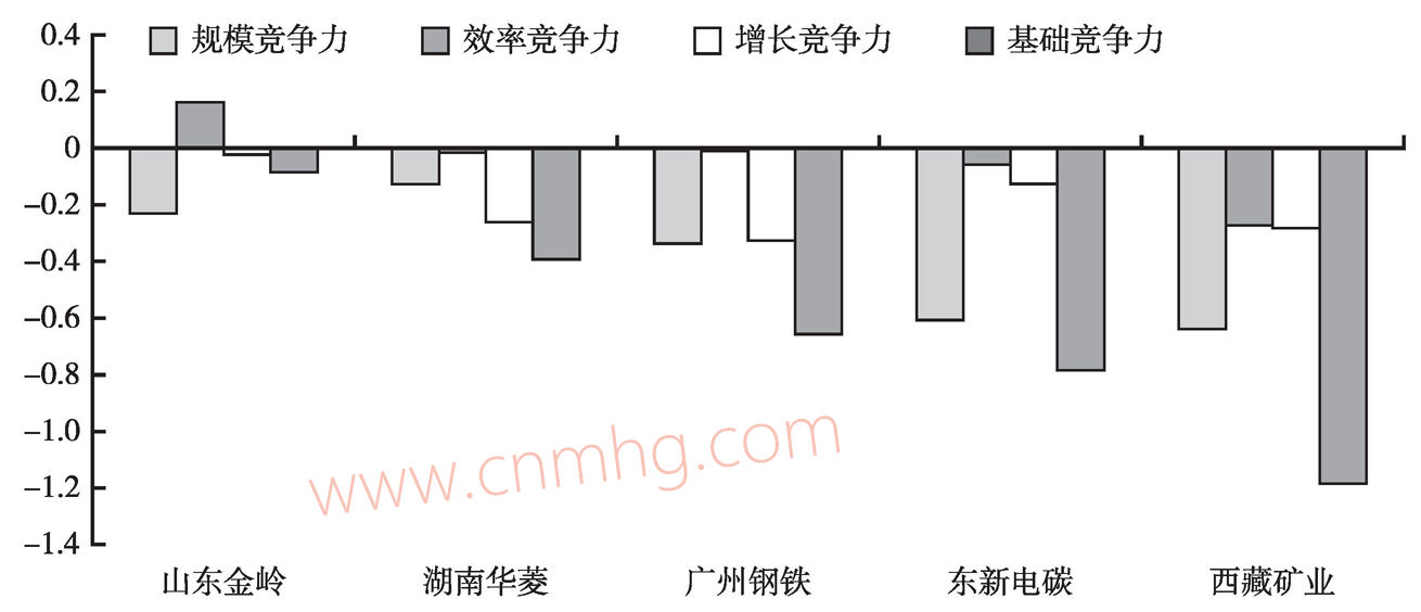 第五組、第六組和第七組黑色金屬上市企業(yè)共5家,其中第七組的企業(yè)數(shù)3家,其余組別各1家。這5家企業(yè)在全部主板上市公司中排名951~1332位(見圖3-12),基礎(chǔ)競爭力得分區(qū)間為-0.0864~-1.1868,其中規(guī)模競爭力得分區(qū)間為-0.6388~-0.1246,效率競爭力得分區(qū)間為-0.2710~0.1668,增長競爭力得分區(qū)間為-0.3222~-0.0211,平均基礎(chǔ)競爭力得分為-0.6210,低于第四組0.7282;平均規(guī)模競爭力、效率競爭力、增長競爭力得分分別為-0.3866、-0.0339、-0.2005。對基礎(chǔ)競爭力的負(fù)貢獻(xiàn)率為62%、6%、32%。該組5家企業(yè)的規(guī)模競爭力和增長競爭力得分全部為負(fù),山東金嶺和廣州鋼鐵的效率競爭力為正,其余企業(yè)效率競爭力得分為負(fù),劣勢明顯,多為經(jīng)營虧損的企業(yè)。值得注意的是排名951位的山東金嶺效率競爭力得分為全行業(yè)第一。金嶺礦業(yè)是一家以鐵礦石開采、鐵精粉銷售為主業(yè)的公司,是中國第一家也是唯一的鐵礦石上市企業(yè),公司2010年通過內(nèi)生性和外延式擴(kuò)張,鐵精粉產(chǎn)量穩(wěn)步增加,業(yè)績保持了穩(wěn)步增長。綜上所述,對這些企業(yè)來說,規(guī)模競爭力和增長競爭力的劣勢最為明顯,由于連續(xù)虧損,企業(yè)規(guī)模急劇縮小,使其競爭力表現(xiàn)異常之差。平均而言,這三組企業(yè)對基礎(chǔ)競爭力連累最大的是規(guī)模和增長因素,排名最后一位的西藏礦業(yè)的效率和增長競爭力得分幾乎持平。