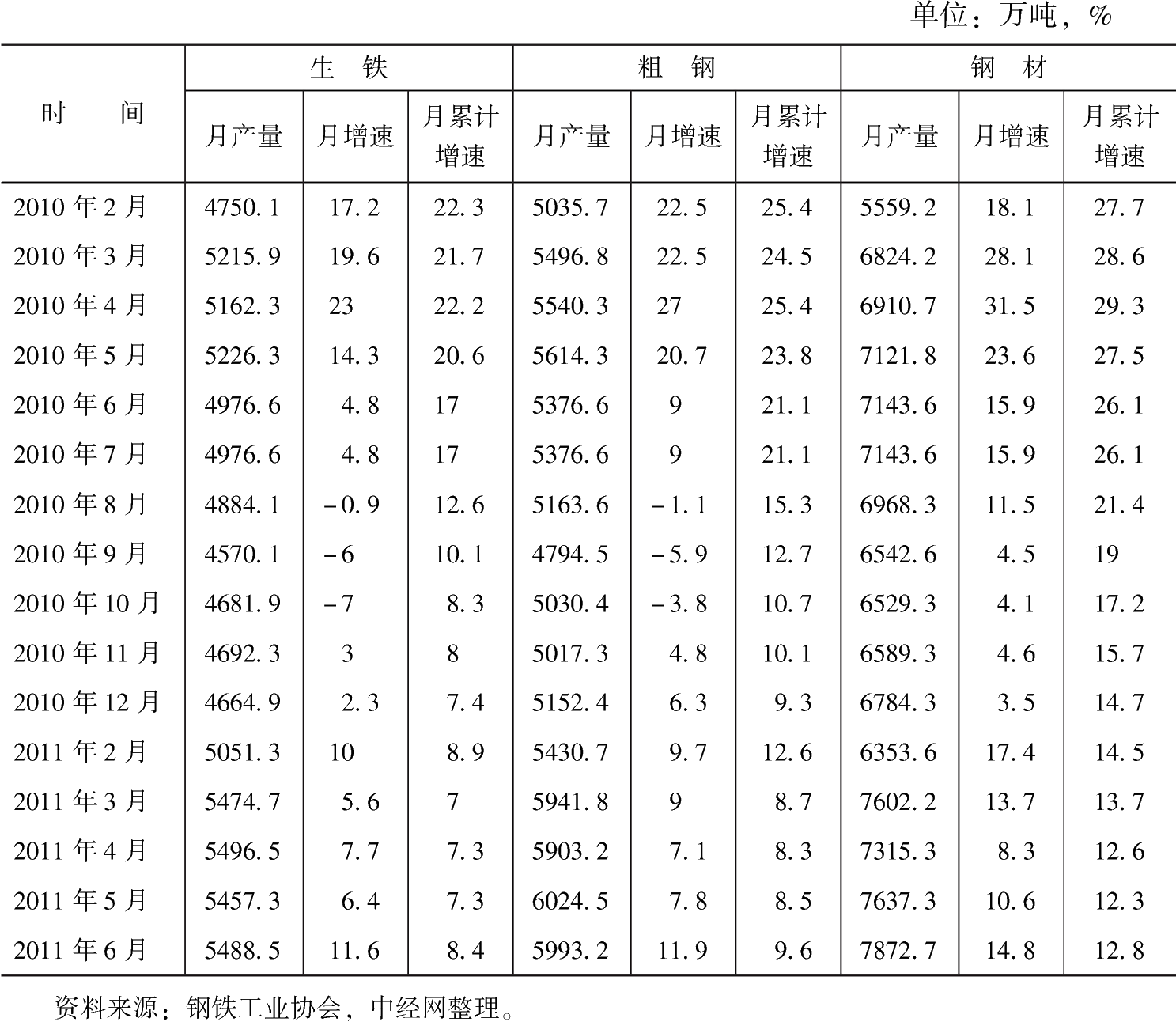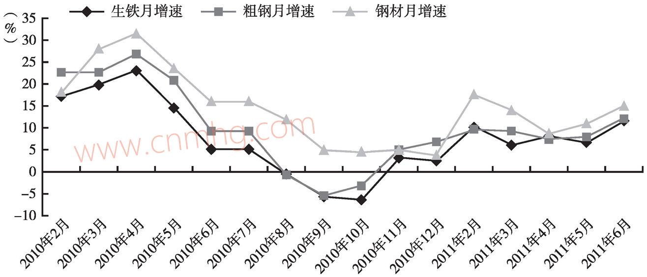 圖3-1 2010年2月至2011年6月生鐵、粗鋼、鋼材產(chǎn)量月增速