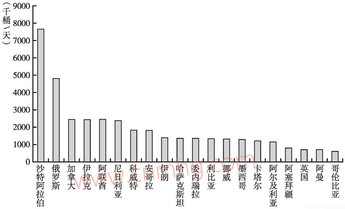 按照2012年的數(shù)據(jù),沙特阿拉伯、俄羅斯、加拿大是世界上前三大石油出口國(guó)。除此之外,前20大石油出口國(guó)還包括伊拉克、阿聯(lián)酋、尼日利亞、科威特、安哥拉、伊朗、哈薩克斯坦、委內(nèi)瑞拉、利比亞、挪威、墨西哥、卡塔爾、阿爾及利亞、阿塞拜疆、英國(guó)、阿曼、哥倫比亞(見(jiàn)圖1.5)。
