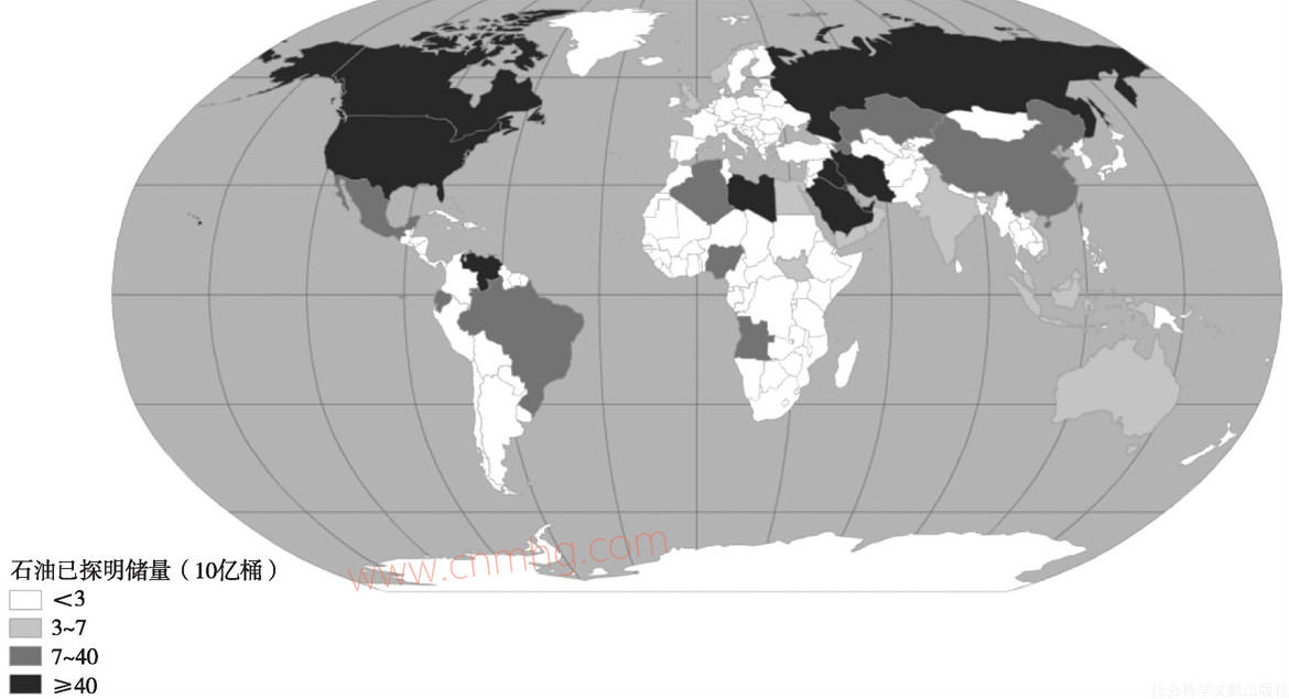 石油產(chǎn)量的空間分布與石油已探明儲(chǔ)量的空間分布大致相同。換句話(huà)說(shuō),各個(gè)國(guó)家在利用石油資源方面的態(tài)度是基本一致的:一旦在國(guó)土之下發(fā)現(xiàn)了石油資源,都會(huì)開(kāi)發(fā)利用,沒(méi)有哪個(gè)國(guó)家會(huì)選擇將寶藏埋藏在地底下,存而不用(見(jiàn)圖1.2)。