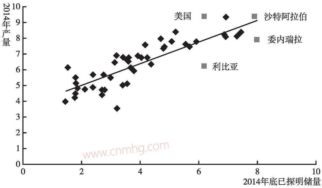 圖1.2 石油產(chǎn)量與已探明儲(chǔ)量的關(guān)系
