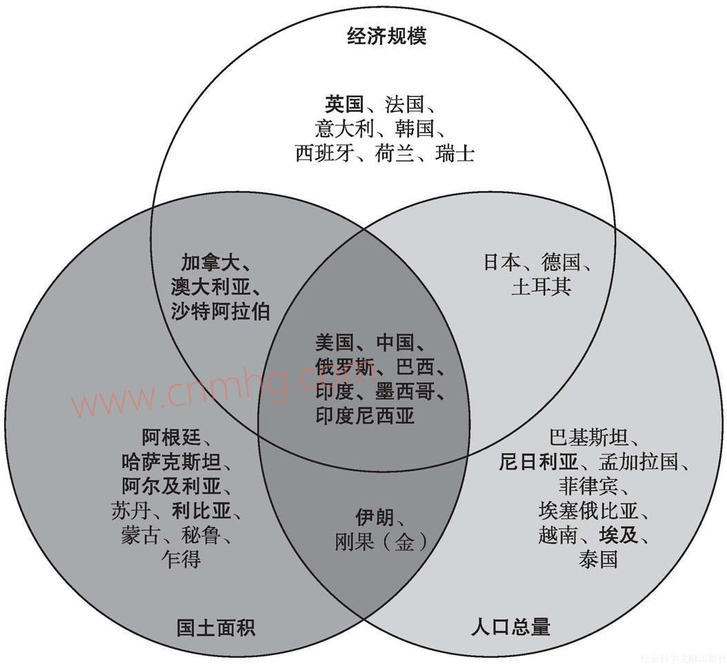 為了對(duì)眾多的石油生產(chǎn)國(guó)有更直觀(guān)的印象,我們不妨做一個(gè)簡(jiǎn)單的比較和歸類(lèi)。馮煦明(2016)[3]曾對(duì)“人口總量”“國(guó)土面積”“經(jīng)濟(jì)規(guī)?!比齻€(gè)參數(shù)在全球排名前20的國(guó)家,運(yùn)用維恩圖分析了大國(guó)的集合關(guān)系(見(jiàn)圖1.3)。我們又在圖中將2014年石油產(chǎn)量排名前30的國(guó)家用加粗字體標(biāo)出。標(biāo)粗國(guó)家的產(chǎn)量占全球總產(chǎn)量的比例都在0.5%以上。